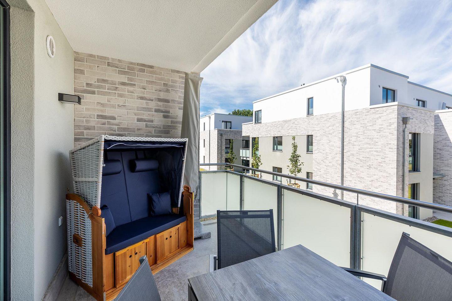 Das 55 m² große und familienfreundliche 2-Zimmer Apartment ist für bis zu 4 Personen geeignet. Besonders hervorzuheben ist der schöne Balkon in Nord-West Lage, ausgestattet mit einem Strandkorb; hier könnt ihr nach einem erlebnisreichen Tag am Strand, die Abendsonne und das wohltuende Meeresklima genießen.