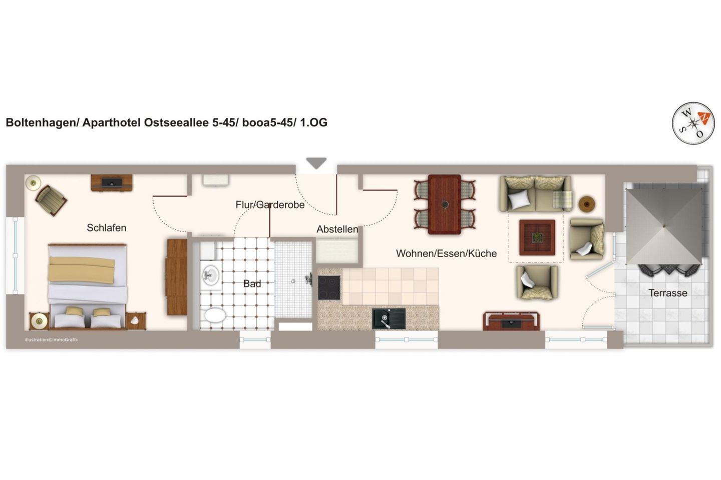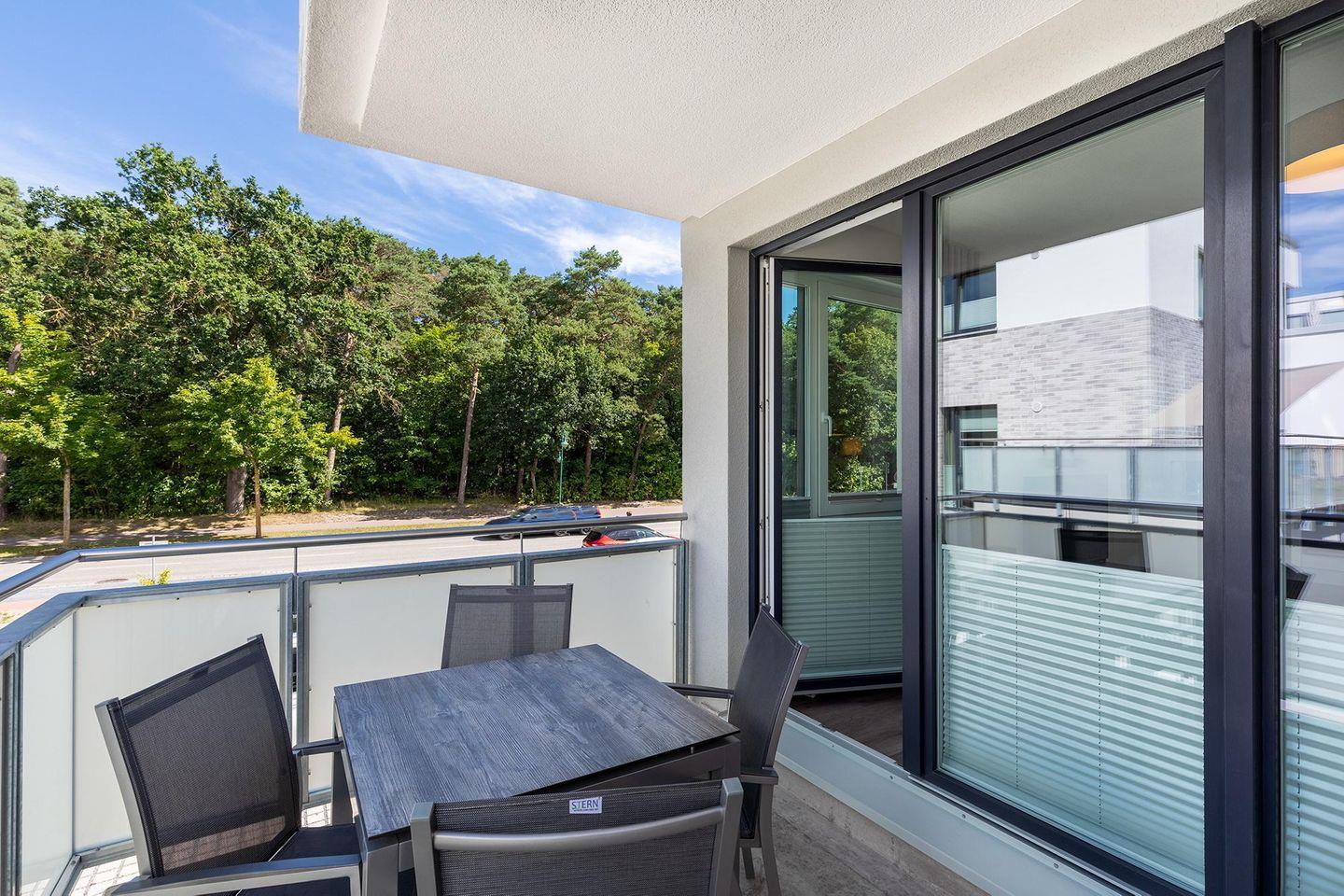 Das helle und moderne Nichtraucher-Apartment verfügt über Fußbodenheizung, bodentiefe Fenster mit 3-fach Isolierung, kostenfreies WLAN und eine voll ausgestattete offene Küche mit Geschirrspüler, Gefrierfach, Kaffeemaschine, Toaster, Wasserkocher, Backofen und Mikrowelle sowie über einen Essbereich. Im Wohnbereich befindet sich eine Doppelschlafcouch (1,60 x 2,00 m) und ein großer Flatscreen-TV mit Blu-ray-Player. Das separate Schlafzimmer ist mit einem modernen Boxspringbett (1,80 x 2,00 m) und einem Flatscreen-TV ausgestattet. Ein Kinderbett kann gegen Entgelt aufgestellt werden und auf Wunsch könnt ihr einen Kinderhochstuhl hinzubuchen. Im stilvollen Badezimmer befinden sich eine ebenerdige Dusche, ein Waschtisch mit Föhn, Kosmetikspiegel und Handtuchheizkörper. Das Apartment verfügt über einen Flur mit Garderobe. Nach einem erholsamen Urlaubstag lässt es sich auf dem mit Gartenmöbeln und Sonnenschirm ausgestatteten Balkon, herrlich entspannen. Der Balkon ist vom Wohnzimmer aus begehbar. Bis auf eine Schwelle zum Balkon ist das Apartment barrierefrei konzipiert.