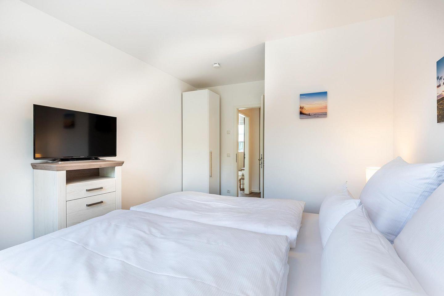 Das helle und moderne Nichtraucher-Apartment verfügt über Fußbodenheizung, bodentiefe Fenster mit 3-fach Isolierung, kostenfreies WLAN und eine voll ausgestattete offene Küche mit Geschirrspüler, Gefrierfach, Kaffeemaschine, Toaster, Wasserkocher, Backofen und Mikrowelle sowie über einen Essbereich. Im großzügigen Wohnbereich befindet sich eine Doppelschlafcouch (1,60 x 2,00 m) und ein großer Flatscreen-TV mit Blu-ray-Player. Beide separaten Schlafzimmer sind jeweils mit einem modernen Boxspringbett (1,80 x 2,00 m) und Flatscreen-TV ausgestattet. Ein Kinderbett kann gegen Entgelt aufgestellt werden und auf Wunsch könnt ihr einen Kinderhochstuhl hinzubuchen. Die beiden stilvollen Badezimmer verfügen jeweils über eine ebenerdige Dusche, WC, Waschtisch, Föhn, Kosmetikspiegel und Handtuchheizkörper. Das hochwertige Apartment verfügt über einen geräumigen Flur mit Garderobe.