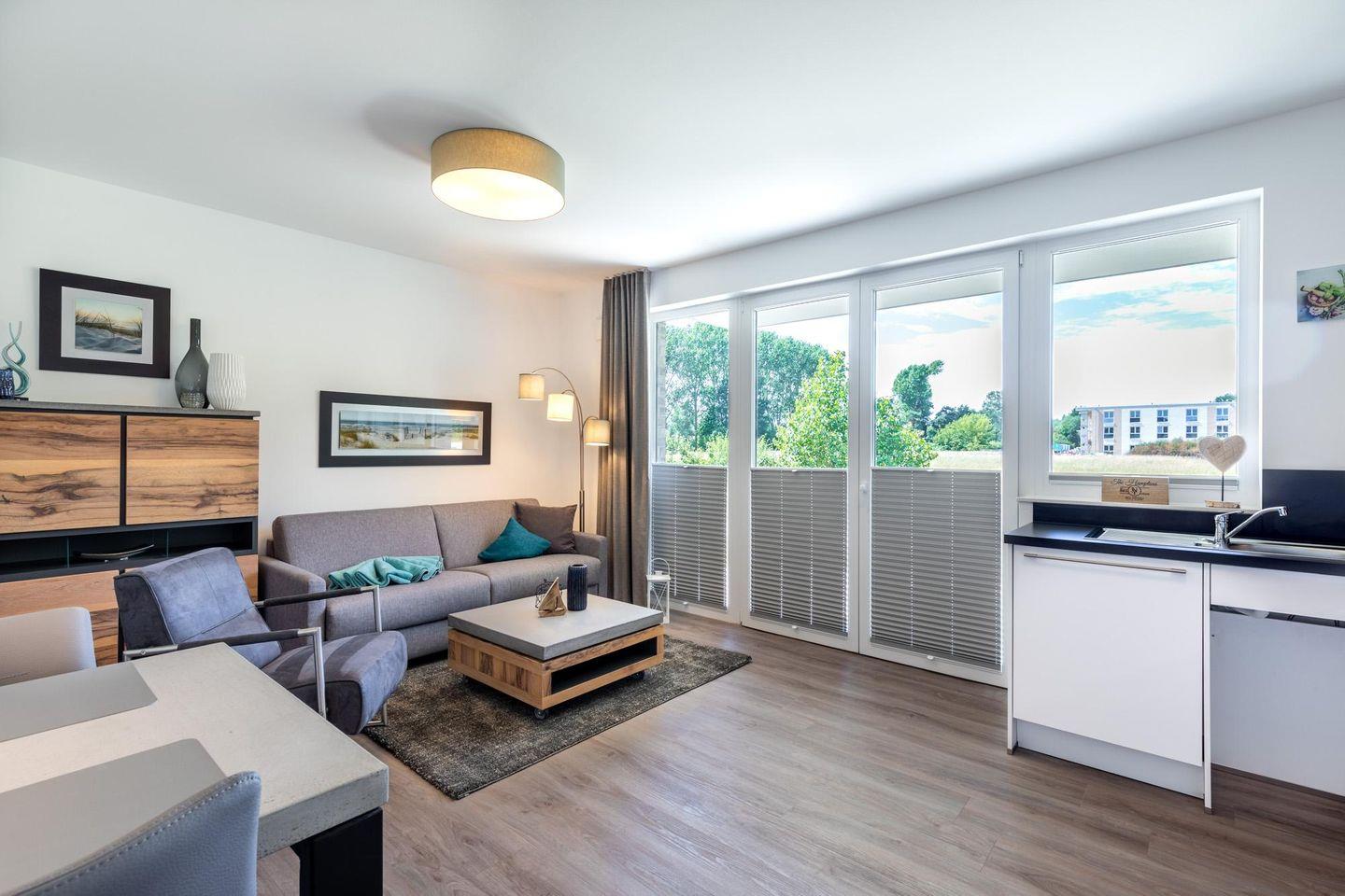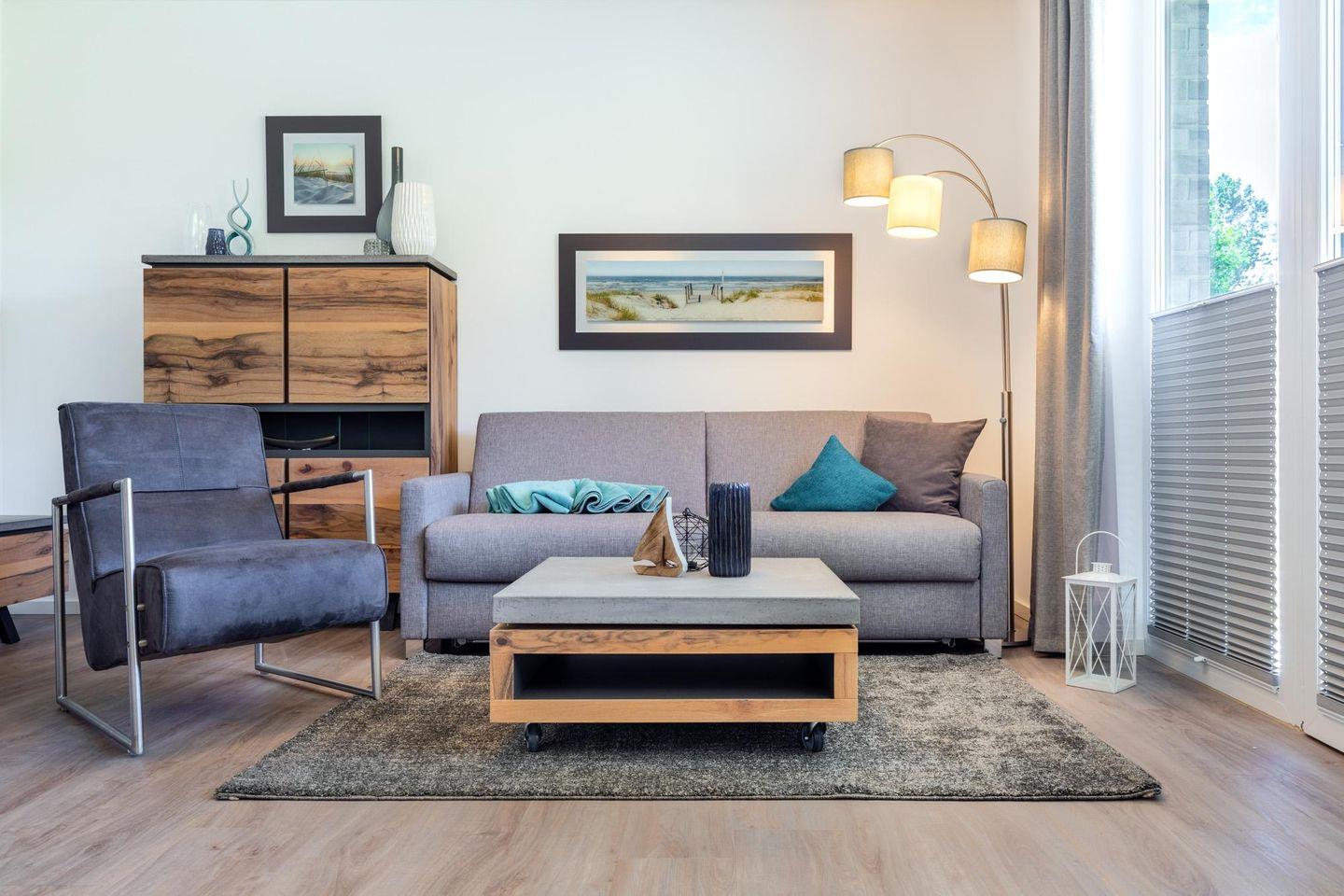 Das familienfreundliche und moderne Nichtraucher-Apartment verfügt über Fußbodenheizung, bodentiefe Fenster mit 3-fach Isolierung, kostenfreies WLAN und eine voll ausgestattete offene Küche mit Geschirrspüler, Gefrierfach, Kaffeemaschine, Toaster, Wasserkocher, Backofen und Mikrowelle sowie über einen Essbereich. Im Wohnbereich befindet sich eine Doppelschlafcouch (1,60 x 2,00 m) und ein großer Flatscreen-TV mit Blu-ray-Player. Das separate Schlafzimmer ist mit einem modernen Boxspringbett (1,80 x 2,00 m) und einem Flatscreen-TV ausgestattet. Ein Kinderbett kann gegen Entgelt aufgestellt werden und auf Wunsch könnt ihr einen Kinderhochstuhl hinzubuchen. Im stilvollen Badezimmer befinden sich eine ebenerdige Dusche, ein Waschtisch mit Föhn, Kosmetikspiegel und Handtuchheizkörper. Das Apartment verfügt über einen Flur mit Garderobe. Nach einem Tag am Meer könnt ihr auf der mit Gartenmöbeln und Sonnenschirm ausgestatteten Terrasse in West-Lage entspannen und dabei die Abendsonne genießen. Die Terrasse ist vom Wohnbereich aus begehbar.