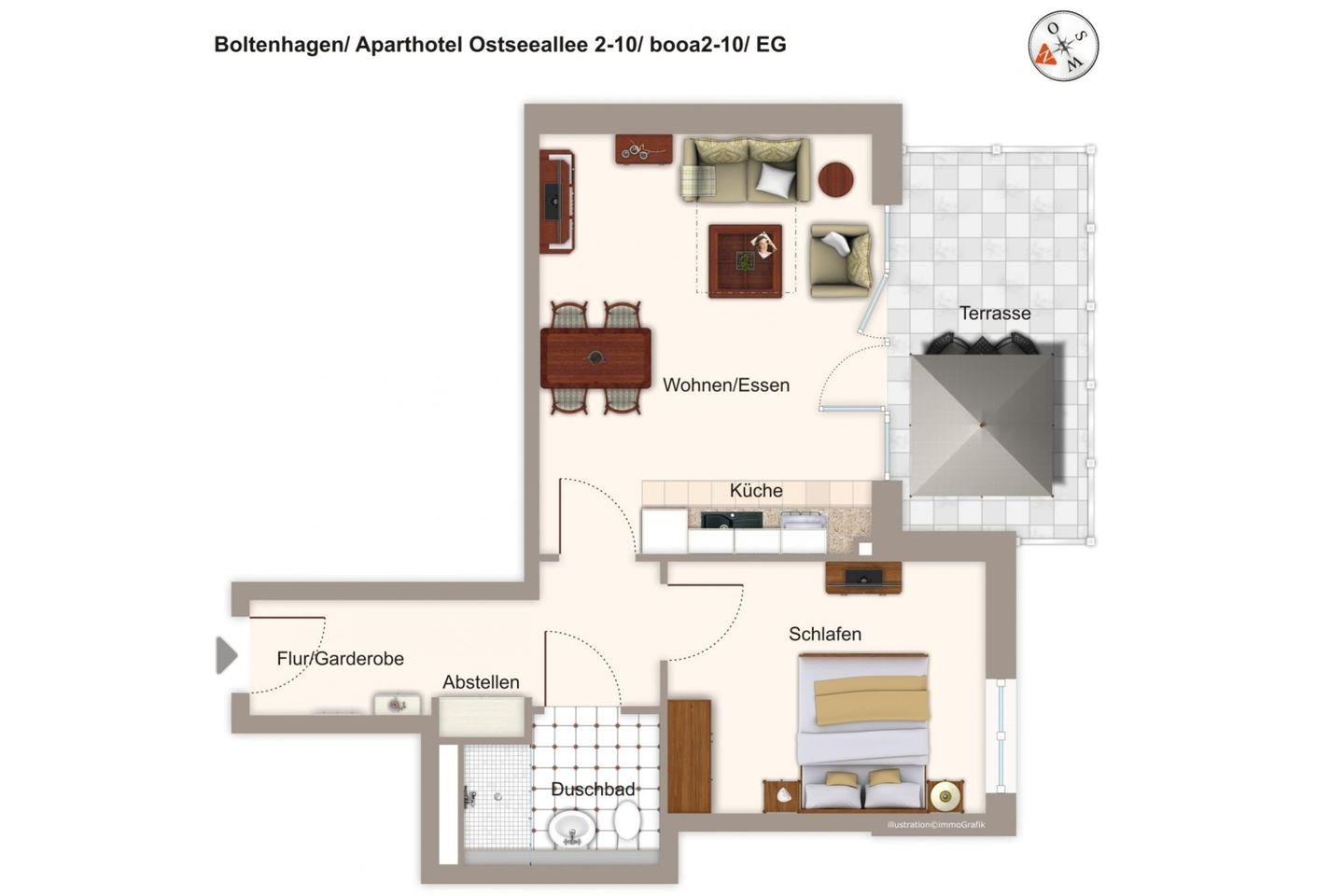 Das exklusive und lichtdurchflutete Apartment befindet sich in westlicher Lage im Erdgeschoss von Haus 2. Die Ostsee liegt praktisch vor der Haustür - in nur 200 Metern erreicht ihr den feinsandigen, kilometerlangen Strand Boltenhagens. Die Seebrücke und der Kurpark sind nur wenige Gehminuten entfernt. In der unmittelbaren Umgebung findet ihr Einkaufsmöglichkeiten, Restaurants und Cafés sowie zahlreiche Freizeitangebote und Ausflugsziele. Wander-und Radwege, ein Kletterpark, Wellness- und Fitnesseinrichtungen sowie vielseitige Veranstaltungen, wie z.B. das beliebte Seebrückenfest, garantieren einen erlebnisreichen Urlaub für die ganze Familie.