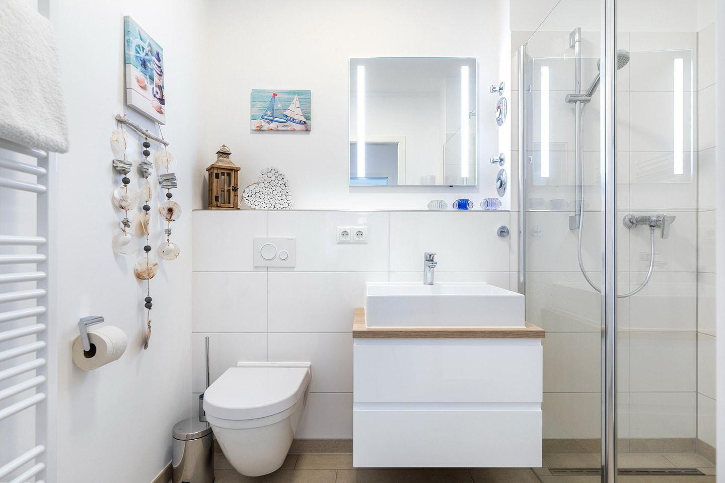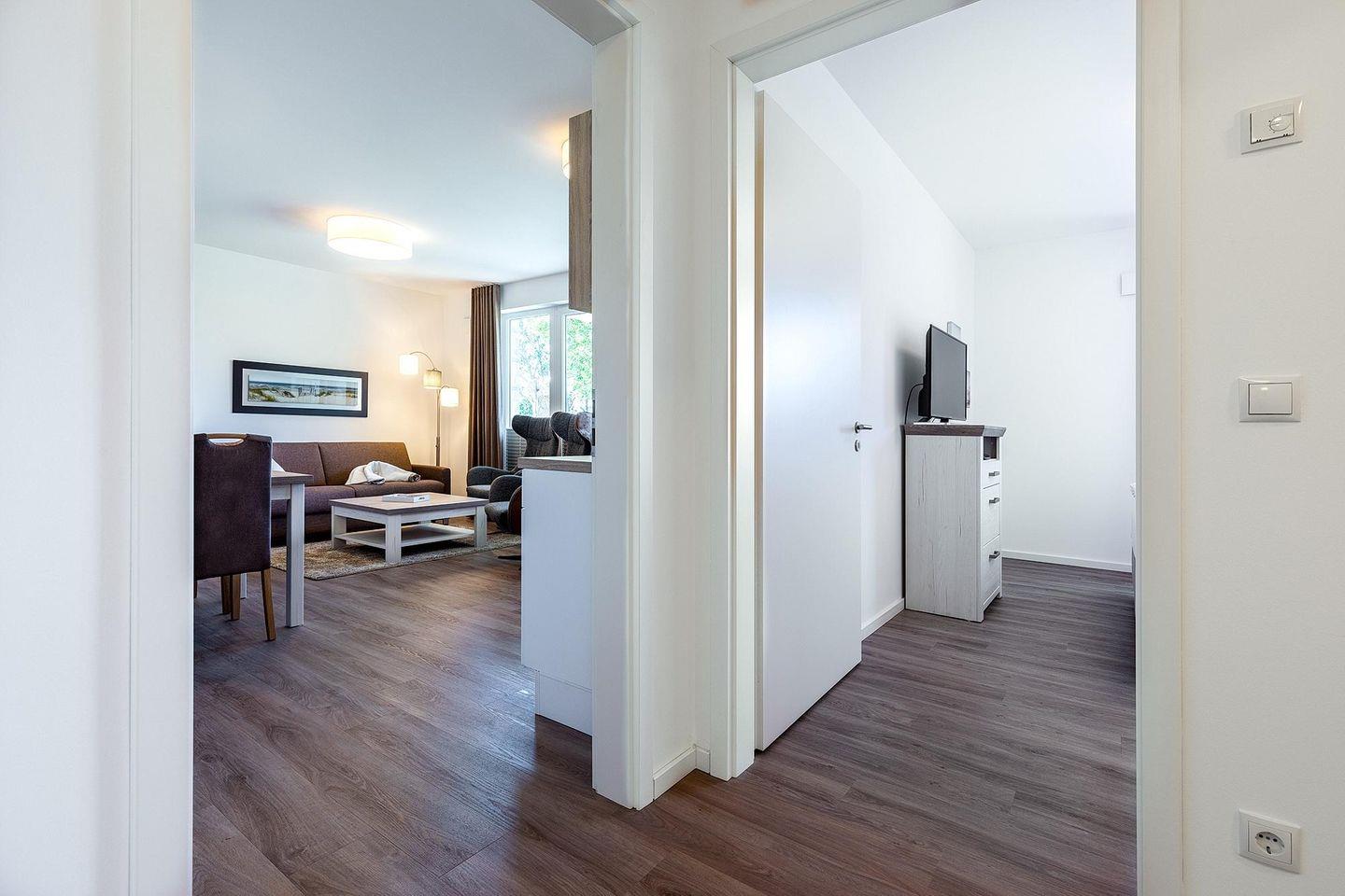Das familienfreundliche und moderne Nichtraucher-Apartment verfügt über Fußbodenheizung, bodentiefe Fenster mit 3-fach Isolierung, kostenfreies WLAN und eine voll ausgestattete offene Küche mit Geschirrspüler, Gefrierfach, Kaffeemaschine, Toaster, Wasserkocher, Backofen und Mikrowelle sowie über einen Essbereich. Im Wohnbereich befindet sich eine Doppelschlafcouch (1,60 x 2,00 m) und ein großer Flatscreen-TV mit Blu-ray-Player. Das separate Schlafzimmer ist mit einem modernen Boxspringbett (1,80 x 2,00 m) und einem Flatscreen-TV ausgestattet. Ein Kinderbett kann gegen Entgelt im Wohnbereich aufgestellt werden und auf Wunsch könnt ihr einen Kinderhochstuhl hinzubuchen. Im stilvollen Badezimmer befinden sich eine ebenerdige Dusche, ein Waschtisch mit Föhn, Kosmetikspiegel und Handtuchheizkörper. Das Apartment verfügt über einen Flur mit Garderobe. Nach einem Tag am Meer könnt ihr auf der mit Gartenmöbeln und Sonnenschirm ausgestatteten Terrasse in Westlage entspannen und dabei die Abendsonne genießen. Die Terrasse ist vom Wohnbereich aus begehbar.