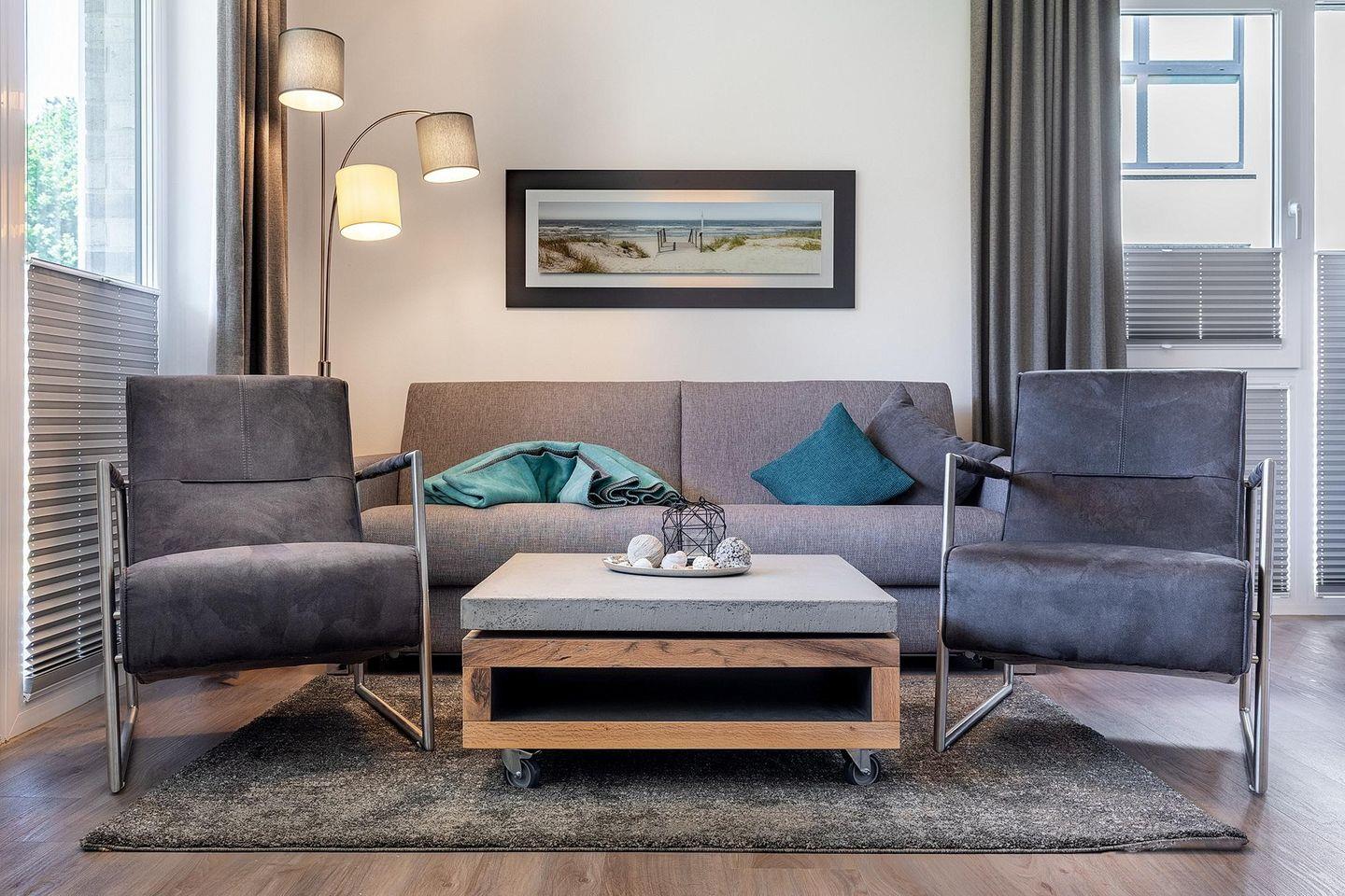 Das familienfreundliche und moderne Nichtraucher-Apartment verfügt über Fußbodenheizung, bodentiefe Fenster mit 3-fach Isolierung, kostenfreies WLAN und eine voll ausgestattete offene Küche mit Geschirrspüler, Kühlschrank mit Gefrierfach, Kaffeemaschine, Toaster, Wasserkocher, Herd und Backofen, Mikrowelle sowie über einen Essbereich. Im Wohnbereich befindet sich eine Doppelschlafcouch (1,80 x 2,00 m) und ein großer Flatscreen-TV mit Blu-ray-Player und HiFi-Anlage/Radio. Das separate Schlafzimmer ist mit einem modernen Boxspringbett (1,80 x 2,00 m) und einem Flatscreen-TV ausgestattet. Ein Kinderbett kann gegen Entgelt im Wohnbereich aufgestellt werden und auf Wunsch könnt ihr einen Kinderhochstuhl hinzubuchen. Im stilvollen Badezimmer befinden sich eine ebenerdige Dusche, ein Waschtisch mit Föhn, Kosmetikspiegel und Handtuchheizkörper. Das Apartment verfügt über einen Flur mit Garderobe. Nach einem Tag am Meer könnt ihr auf der mit Gartenmöbeln und Sonnenschirm ausgestatteten Terrasse in Westlage entspannen und dabei die Abendsonne genießen. Die Terrasse ist vom Wohnbereich aus begehbar.