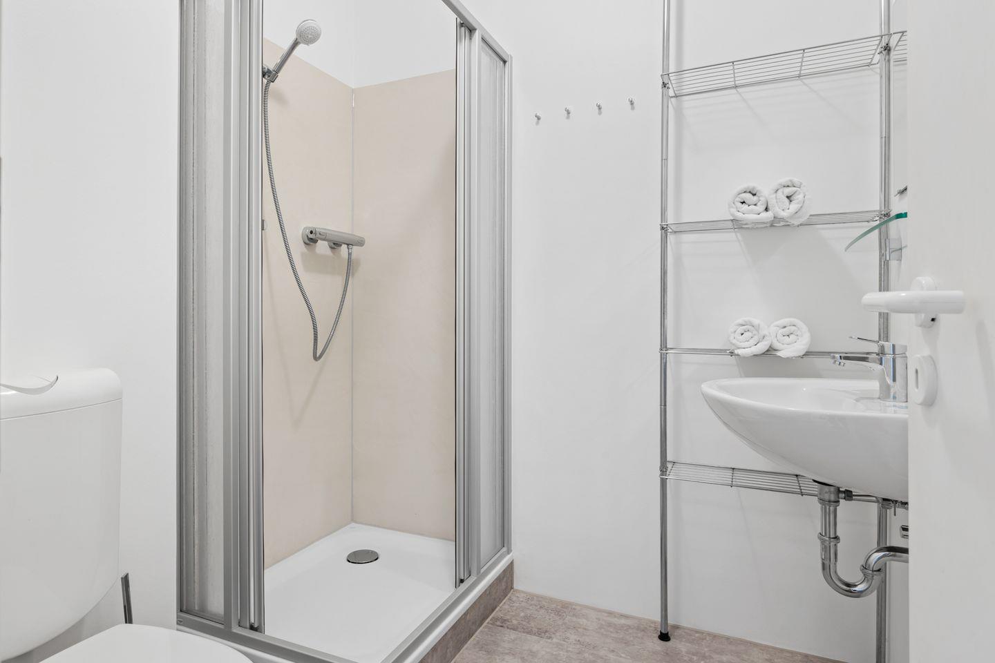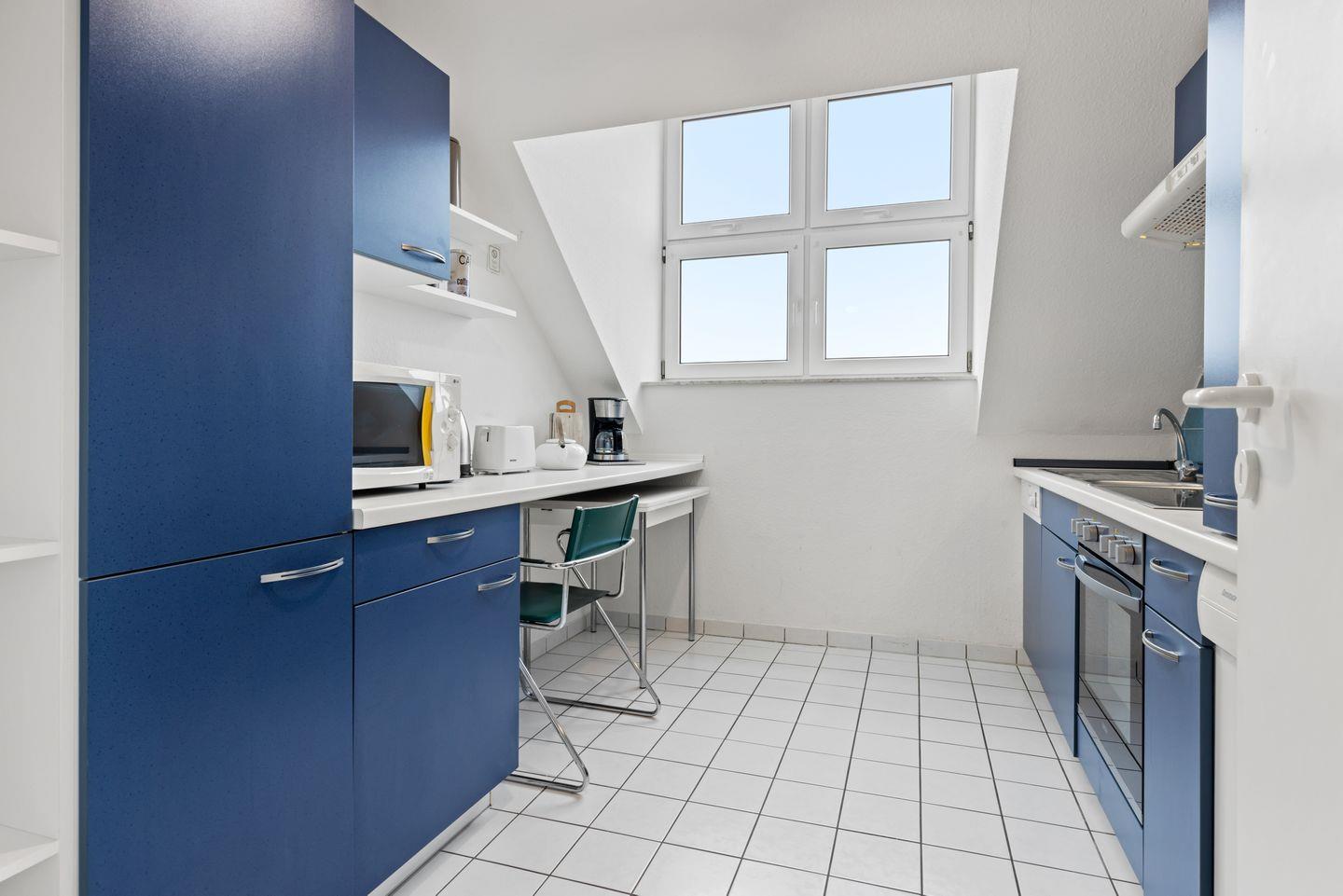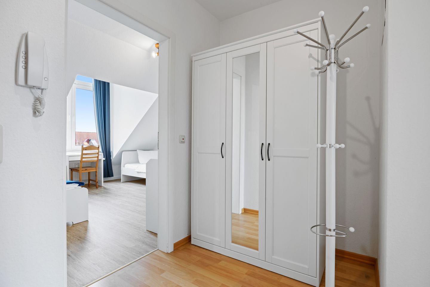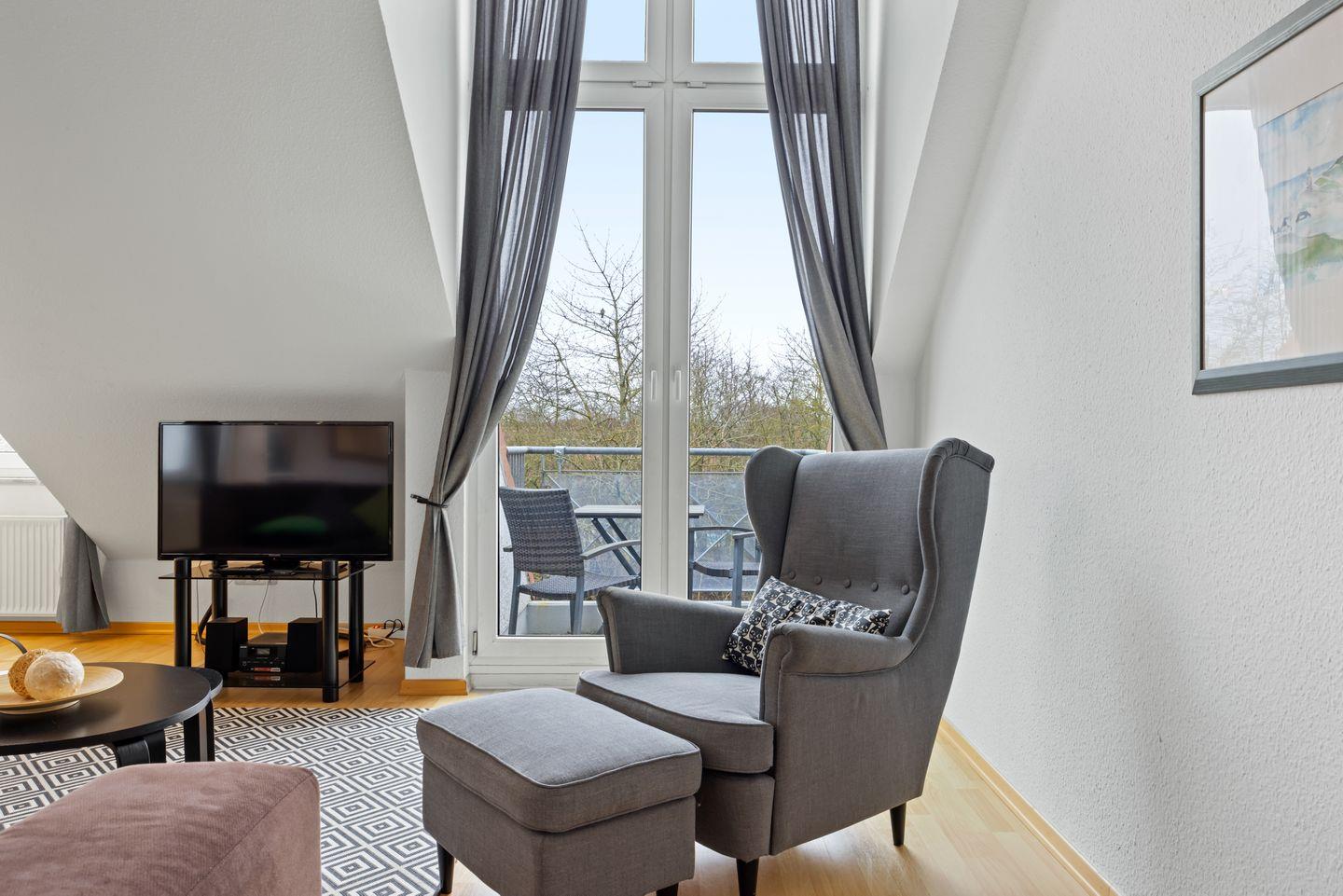 Die Ausstattung der Ferienwohnung ergibt sich weiterhin aus einem kleinen Balkon für zwei Personen, einem Bad mit Dusche und einem Gäste-WC. Das Apartment verfügt über ein Bügeleisen mit Bügelbrett, der Flur und das Wohnzimmer sind mit Laminat ausgelegt.