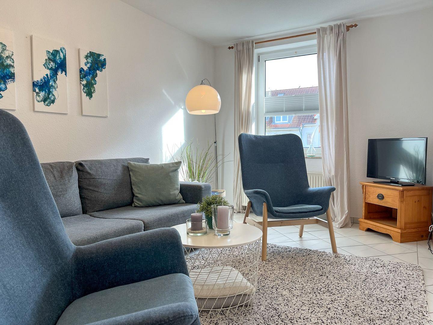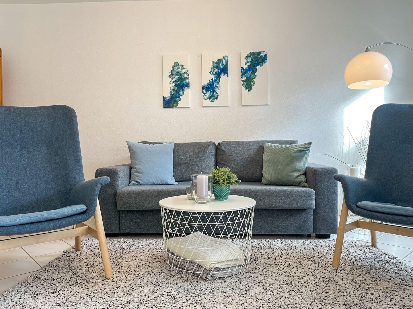 Den möblierten Balkon erreichst du vom Wohnzimmer aus. Hier kannst du die Sonne genießen. Im Wohnraum befinden sich der Essbereich und eine moderne Schlafcouch (140 x 200 cm). Zwei bequeme Relax-Sessel und ein Teppich sorgen zusätzlich für Gemütlichkeit. Ein moderner Flachbild-TV, eine Auswahl an Büchern und Spiele dienen der Unterhaltung. Für den Sichtschutz im Wohnzimmer wurden Plissees verwendet.