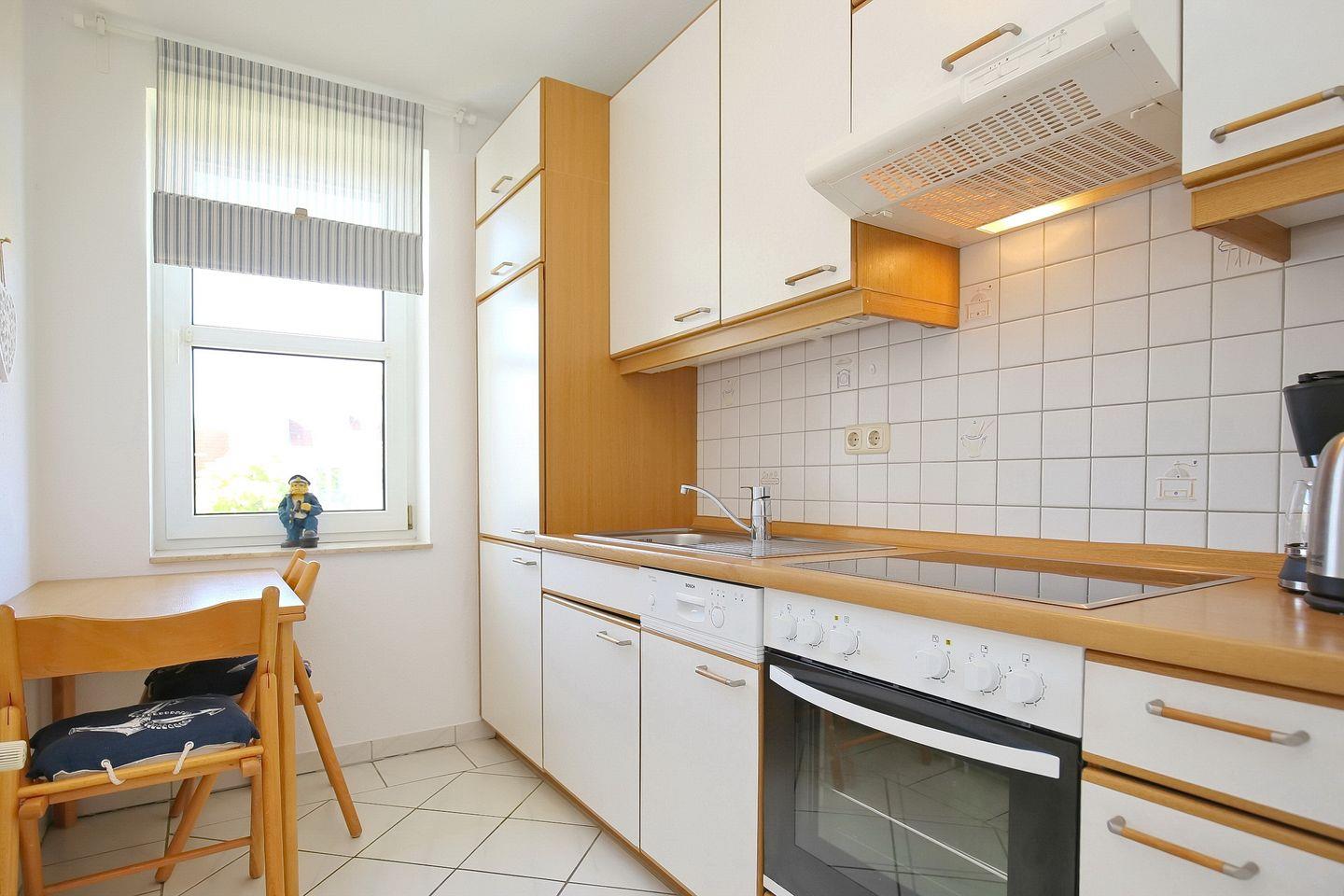 In der separaten Küche gibt es einen Geschirrspüler, ein Cerankochfeld, einen Backofen, einen Kühlschrank mit Gefrierfach und eine Mikrowelle. In der gesamten Wohnung wurden Fliesen verlegt.