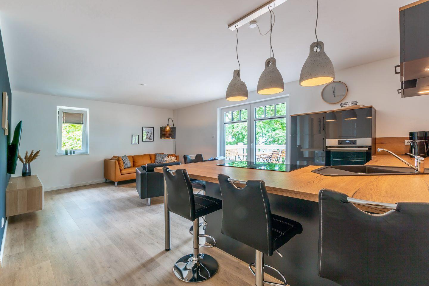Die im Wohnzimmer integrierte Küche lässt keine Wünsche offen. Es ist alles vorhanden, was du zur Zubereitung der Mahlzeiten benötigst. Dazu zählen ein Herd mit 4 Cerankochfeldern sowie ein Backofen, ein Kühlschrank mit Gefrierfach, eine Geschirrspülmaschine, eine Mikrowelle, ausreichend Geschirr, Besteck und Gläser. Des Weiteren verfügt die Küche über einen Tresen, an dem du gemeinsam kochen und speisen kannst.