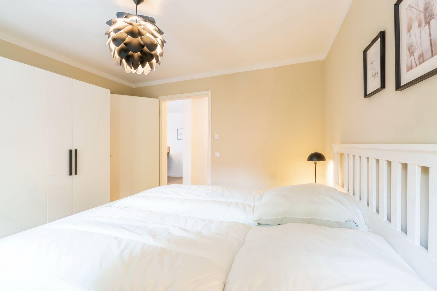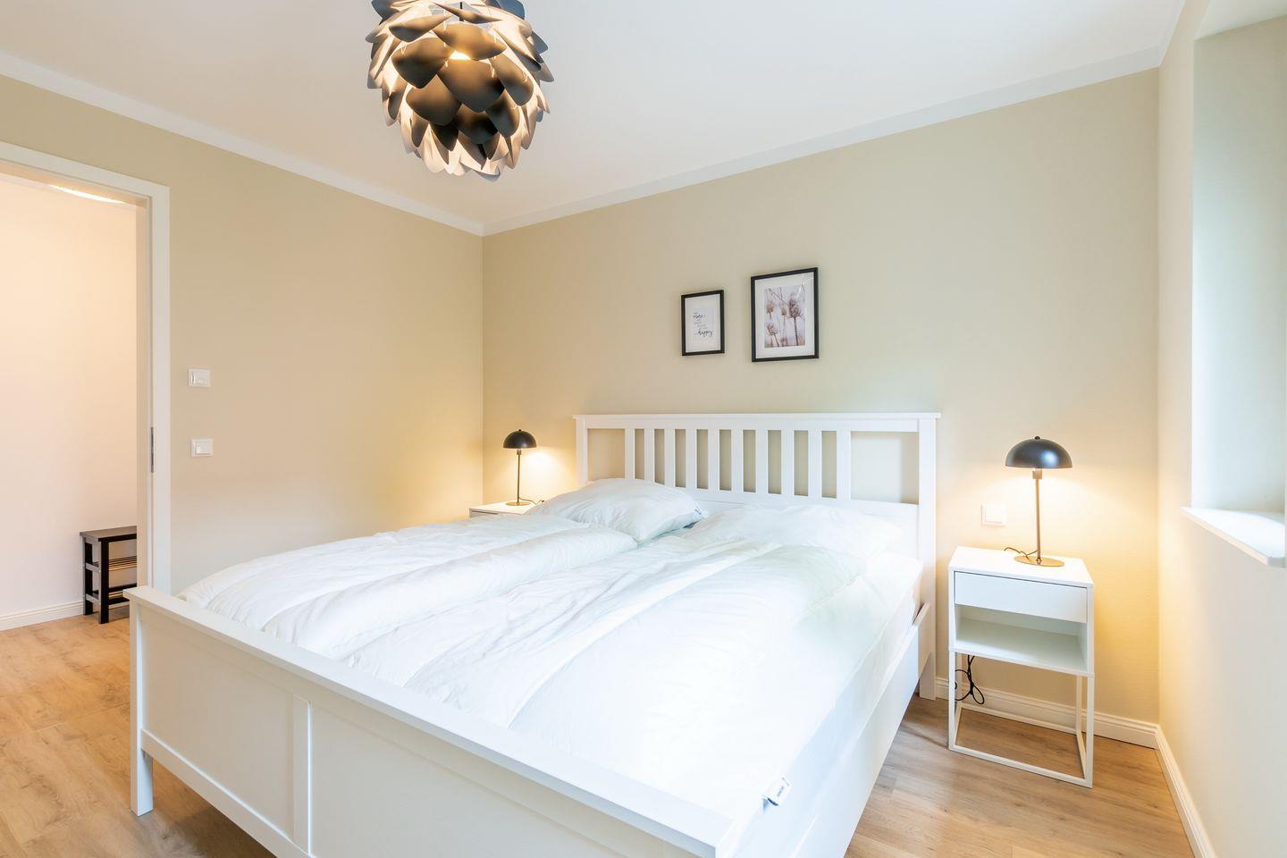 Das erste Schlafzimmer ist über den Flur erreichbar. In diesem gibt es ein komfortables Doppelbett (2 x 90 x 200 cm). Die Aufbewahrung deiner Kleidung ist kein Problem, da das Schlafzimmer über einen geräumigen Kleiderschrank verfügt. Selbstverständlich kannst du die Fenster mit Plissees verdunkeln.