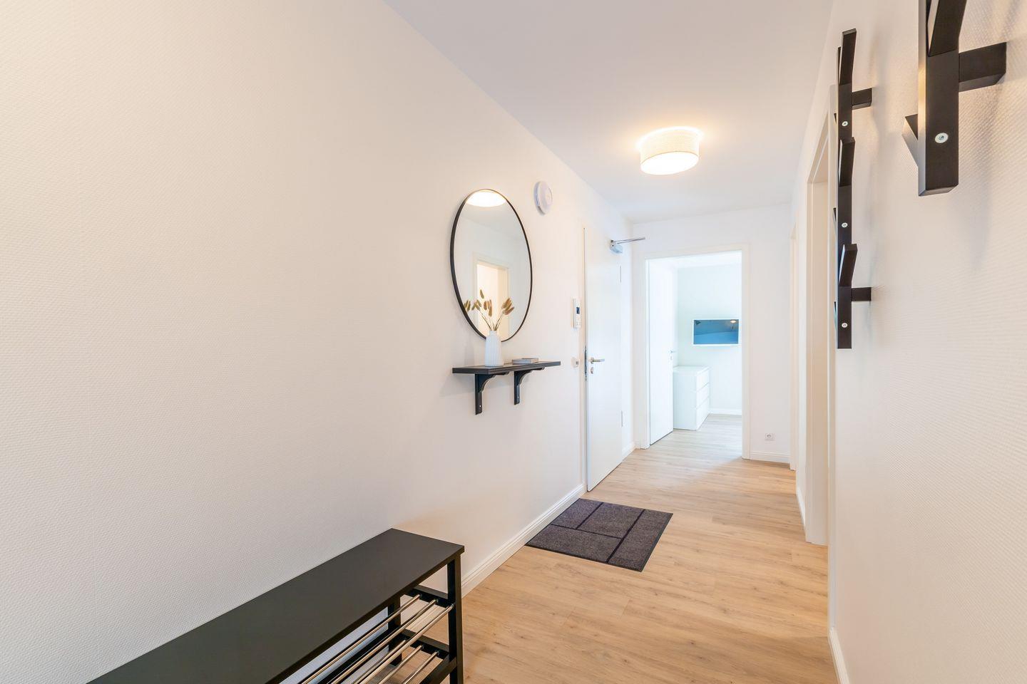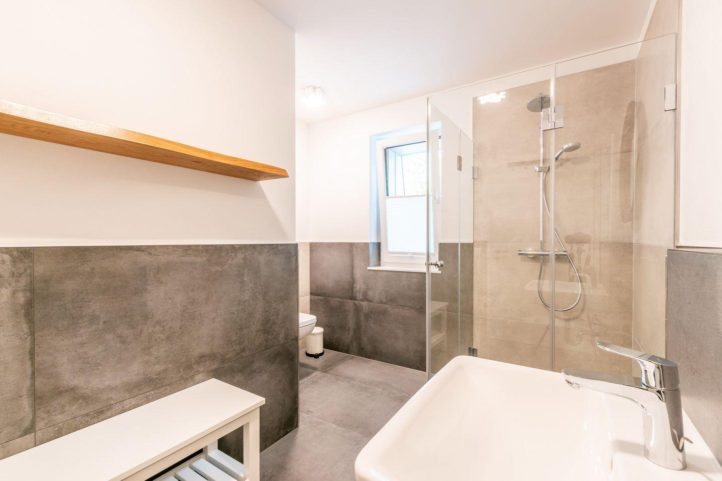 Das stilvolle Bad ist modern gefliest und mit einem Waschtisch, einer bodengleichen Dusche, einem WC sowie einem Handtuchheizkörper ausgestattet. Zusätzlich ist ein Gäste-WC vorhanden.