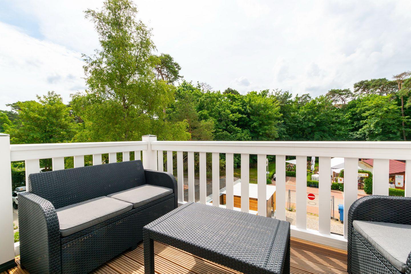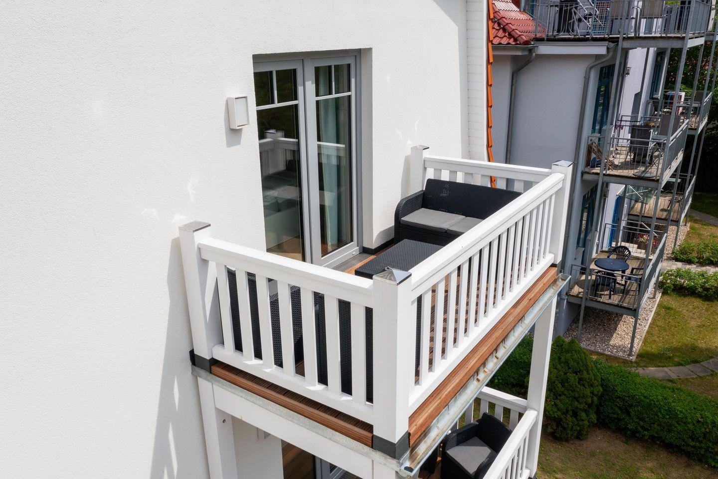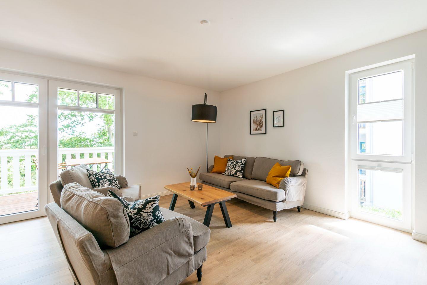 Das Wohnzimmer lädt dich zum Wohlfühlen und Entspannen ein. Bodentiefe Fensterelemente bieten dir ein großzügiges Wohngefühl. Neben der Standardausstattung des Wohnzimmers, wie zum Beispiel einer gemütlichen Couch sowie zwei Sesseln, ist selbstverständlich ein großer Flachbildfernseher vorhanden. Vom Wohnzimmer aus gelangst du auf den möblierten Balkon, der zur Seeseite ausgerichtet ist.