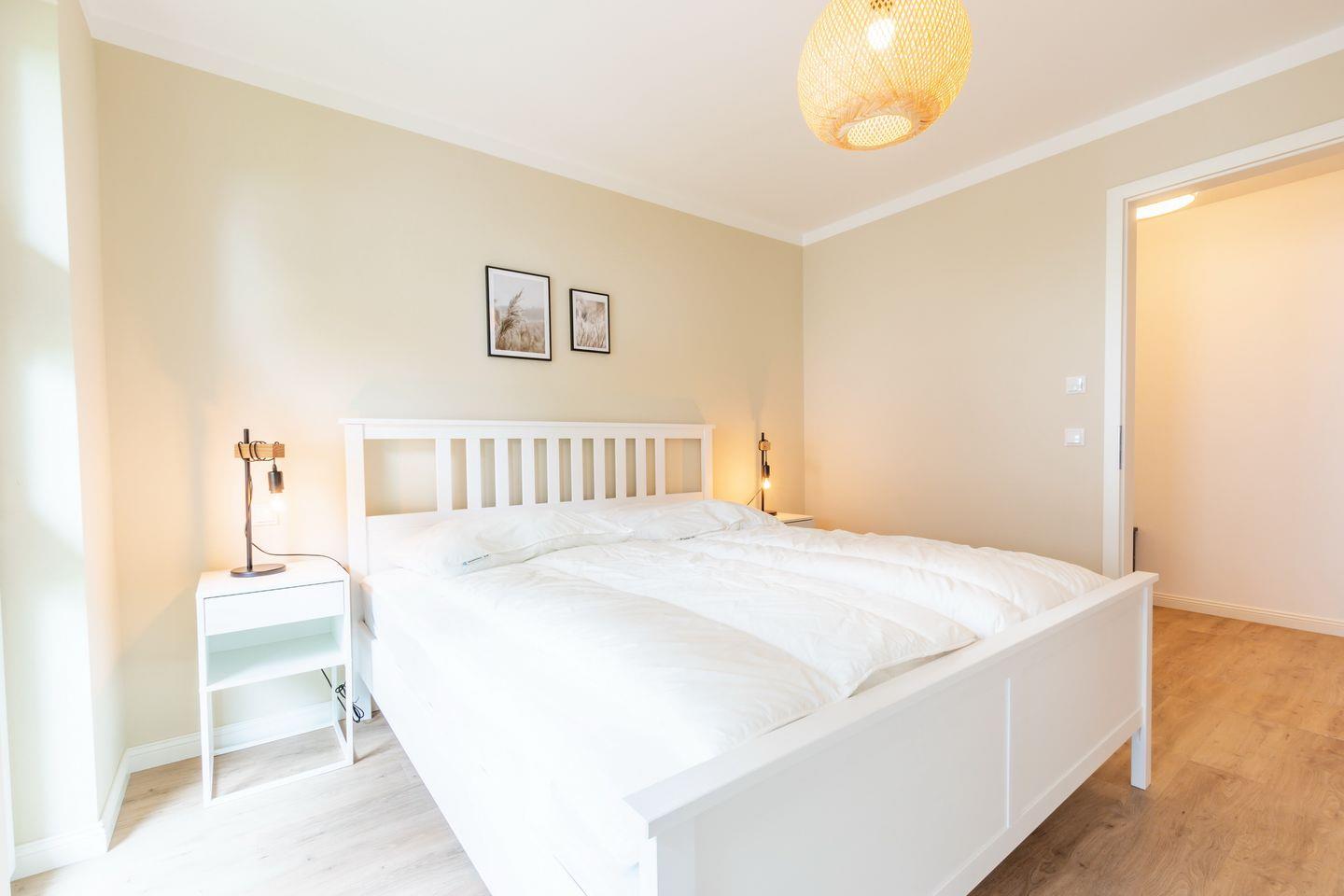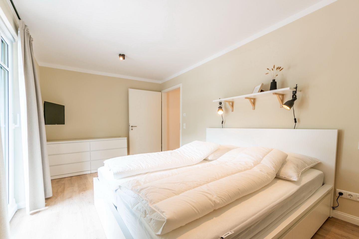 Das erste Schlafzimmer ist über den Flur erreichbar. In diesem gibt es ein komfortables Doppelbett (2 x 90 x 200 cm). Die Aufbewahrung deiner Kleidung ist kein Problem, da das Schlafzimmer über einen geräumigen Kleiderschrank verfügt. Selbstverständlich kannst du die Fenster mit Plissees verdunkeln.