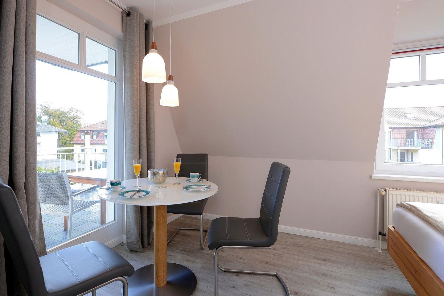 Die Nichtraucher-Wohnung verfügt über kostenfreies WLAN und eine voll ausgestattete offene Küche mit Geschirrspüler, Gefrierfach, Kaffeemaschine, Toaster, Wasserkocher, Ceranherd und Backofen. Im kombinierten Wohn-Schlafbereich befinden sich ein Doppelbett (1,60 x 2,00 m), ein Flatscreen-TV (32 Zoll), Blu-ray-Player, HiFi-Anlage, Gesellschaftsspiele und Bücher. Das moderne Badezimmer mit Tageslicht beinhaltet Dusche, WC, Waschbecken, Föhn und Handtuchwärmer. Nach einem erholsamen Urlaubstag lässt es sich auf dem großzügigen, mit Gartenmöbeln und Sonnenliegen ausgestatteten und nach Norden gelegenen Balkon, herrlich entspannen.