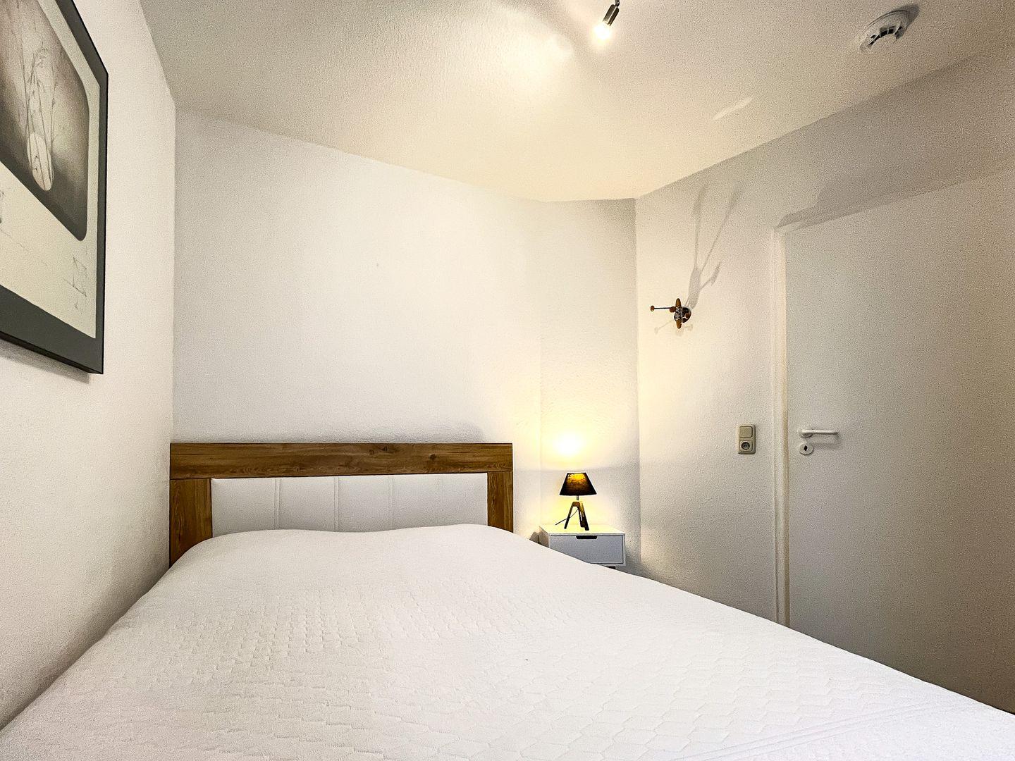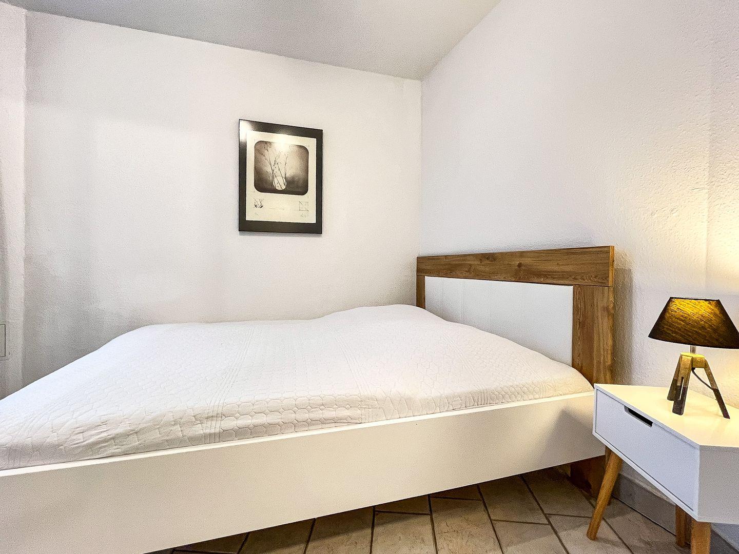 Ein Schlafzimmer mit einem Doppelbett (160 x 200 cm) und einem Kleiderschrank lädt zum Träumen ein.