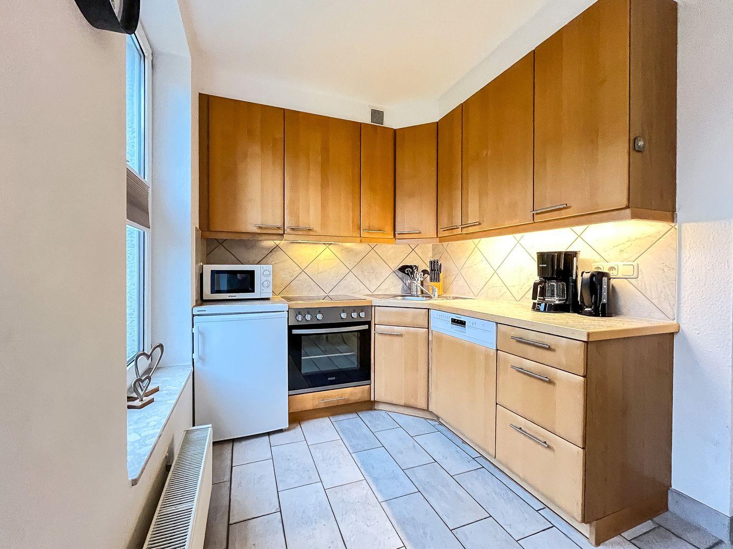 In der voll ausgestatteten Küche sind eine Mikrowelle, ein Geschirrspüler, ein 4-Plattenherd mit Backofen, ein Kühlschrank mit Gefrierfach sowie ein Optigrill vorhanden. Der Boden ist in der gesamten Wohnung gefliest.