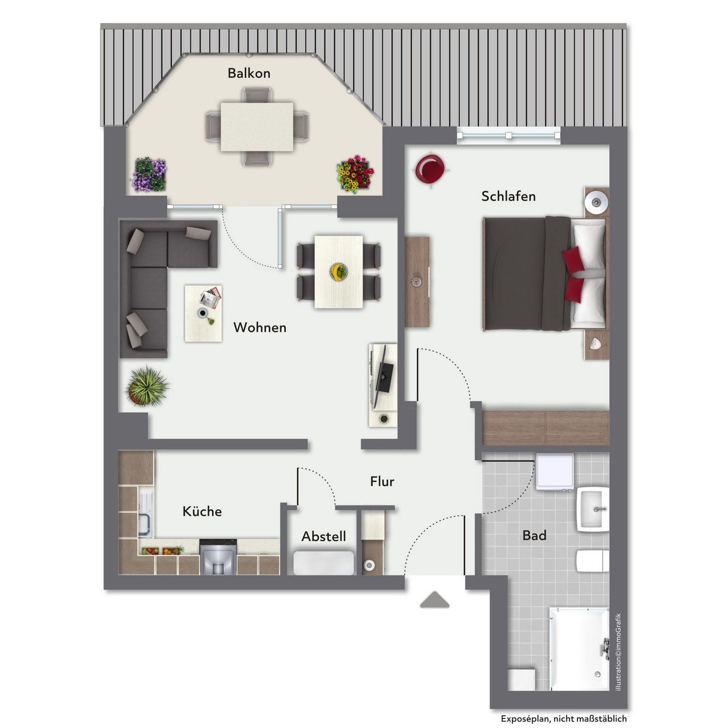 Der Wohnbereich ist hell und modern eingerichtet. Hier lädt die gemütliche Couch zum Verweilen ein. Es steht dir ein Flachbild-TV zur Verfügung. Vom Wohnzimmer aus gelangst du auf den Balkon, welcher mit Balkonmöbeln ausgestattet ist.