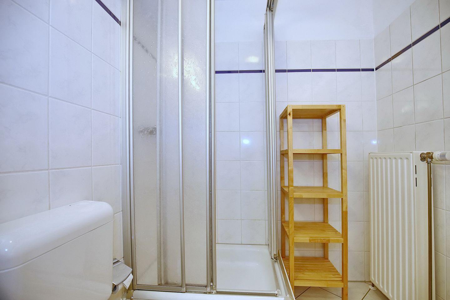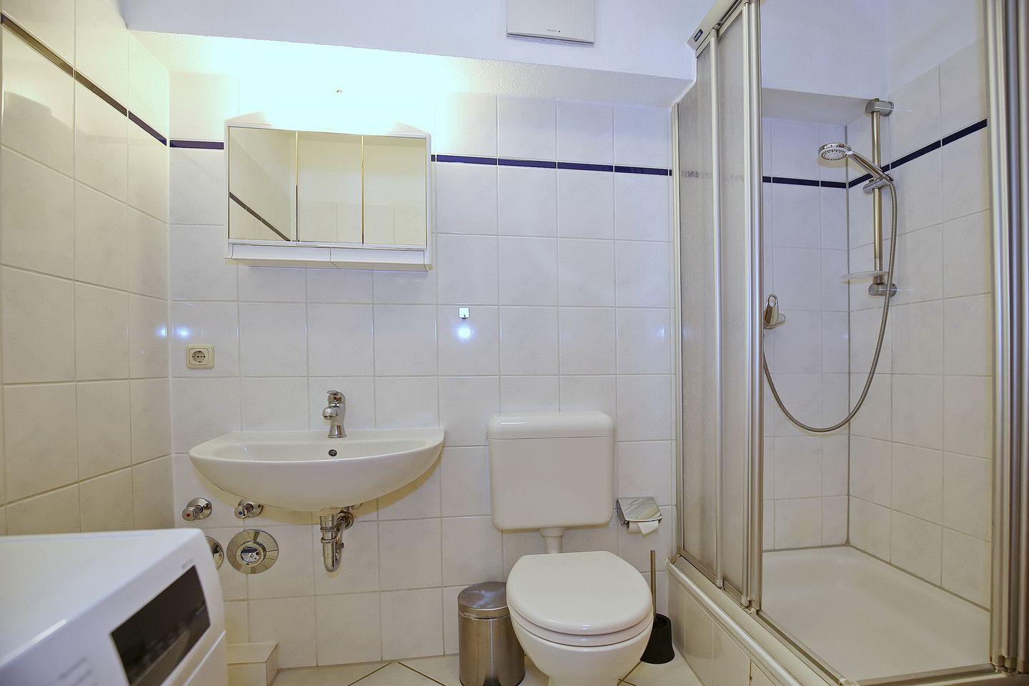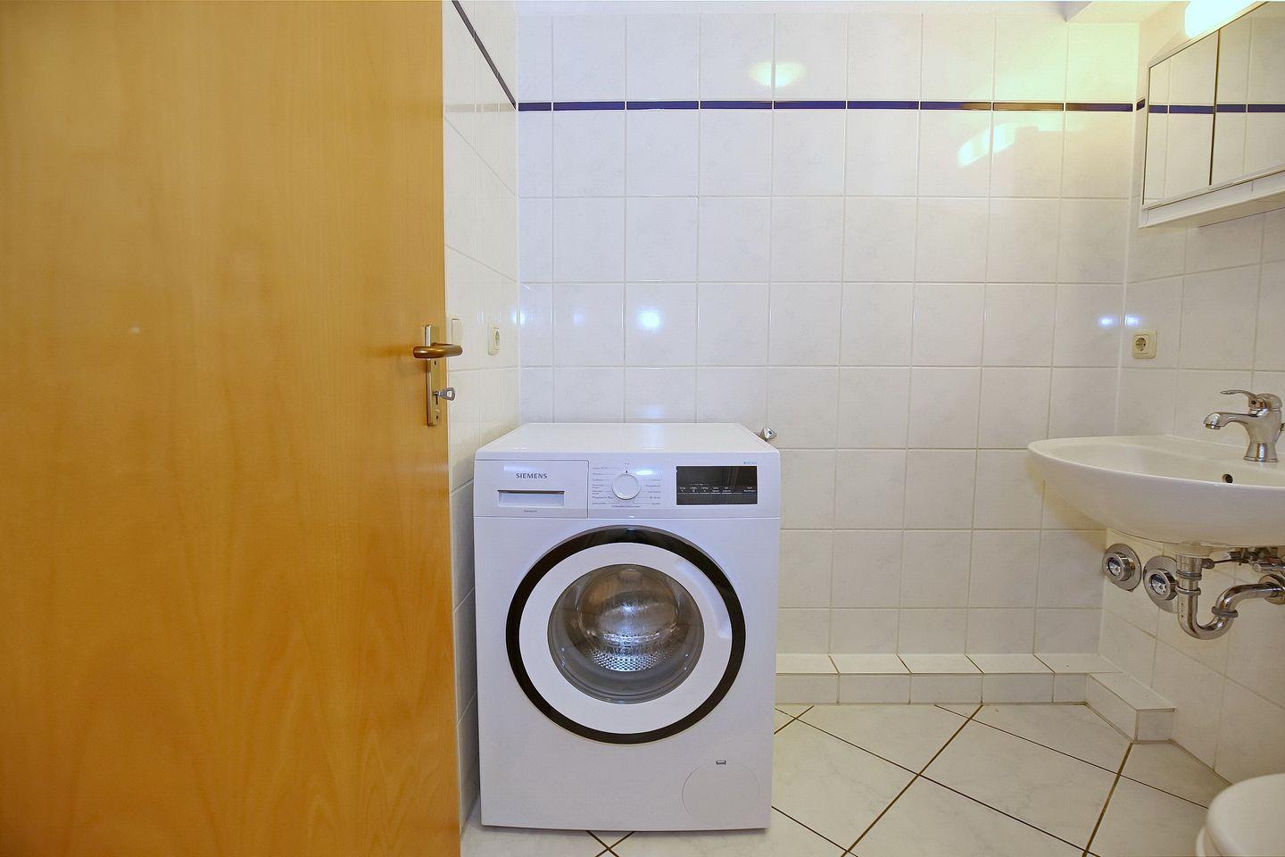 In dem großzügigen Badezimmer mit Dusche befindet sich auch die Waschmaschine.