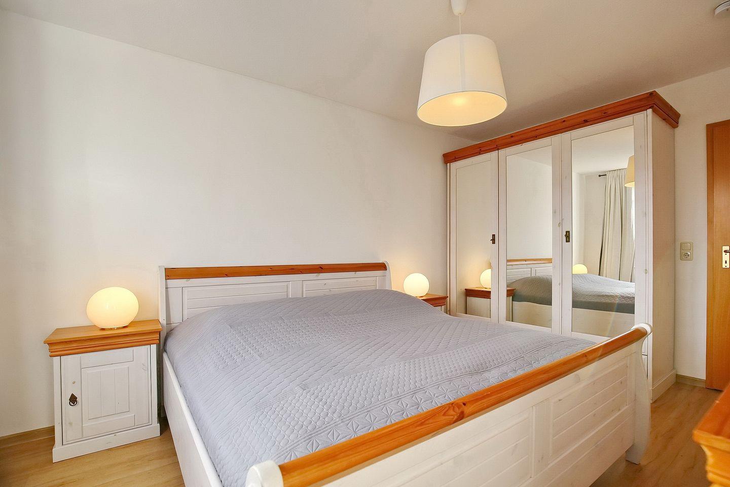Das Schlafzimmer der Ferienwohnung ist mit einem Doppelbett (2 x 90 x 200 cm) ausgestattet. Es hat einen Kleiderschrank, der viel Stauraum bietet. Für die Verdunkelung sind Vorhänge angebracht.