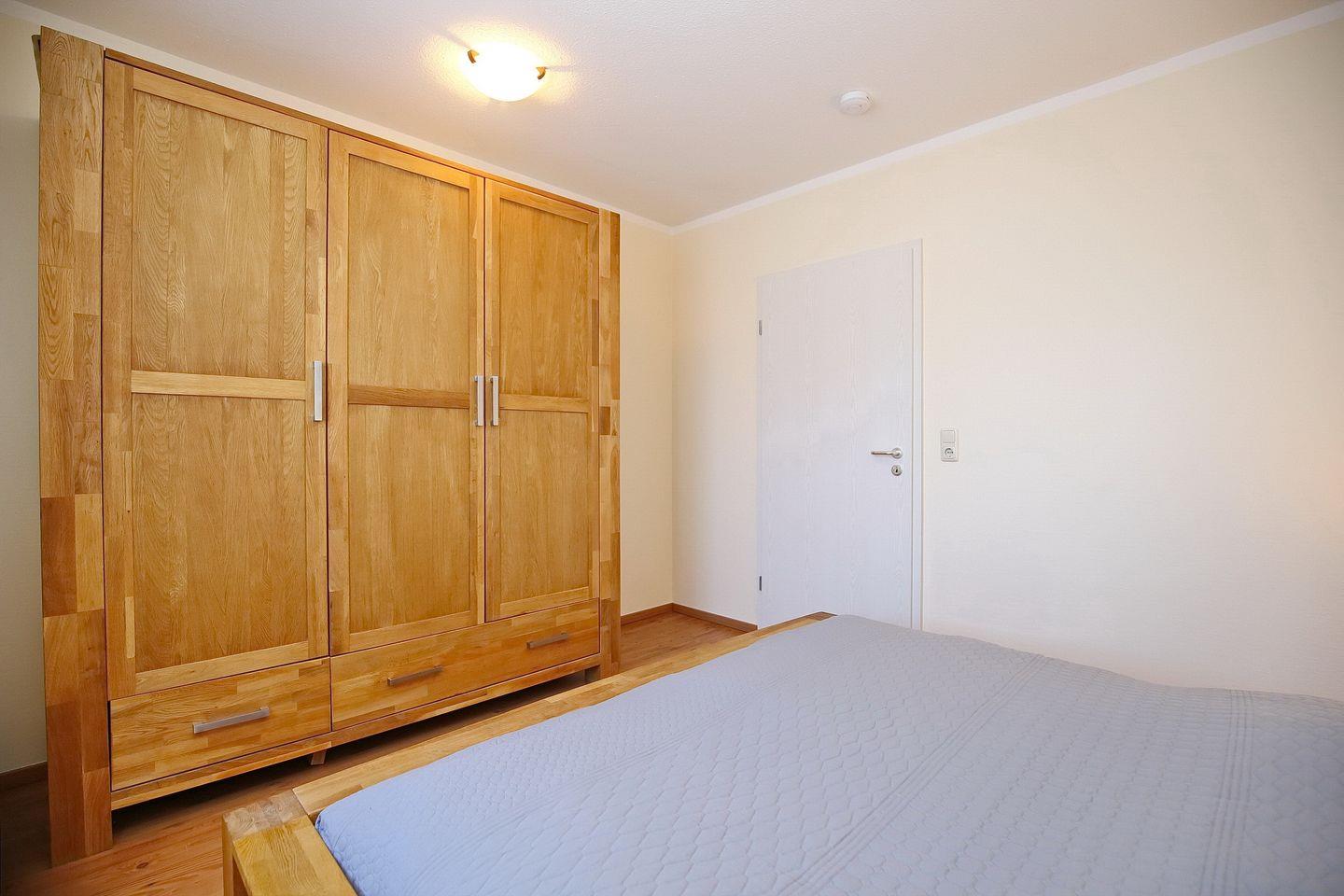 Das separate Schlafzimmer verfügt über ein Doppelbett mit 7-Zonen-Taschenfederkern-Matratzen (2 x 90 x 200 cm). Die Matratzen haben eine härtere und eine weichere Seite. Des Weiteren findest du einen Kleiderschrank mit viel Stauraum für deine Urlaubsgarderobe sowie lichtdichte Vorhänge. Außerdem ist hier genügend Platz, um ein Kinderreisebett aufzustellen.