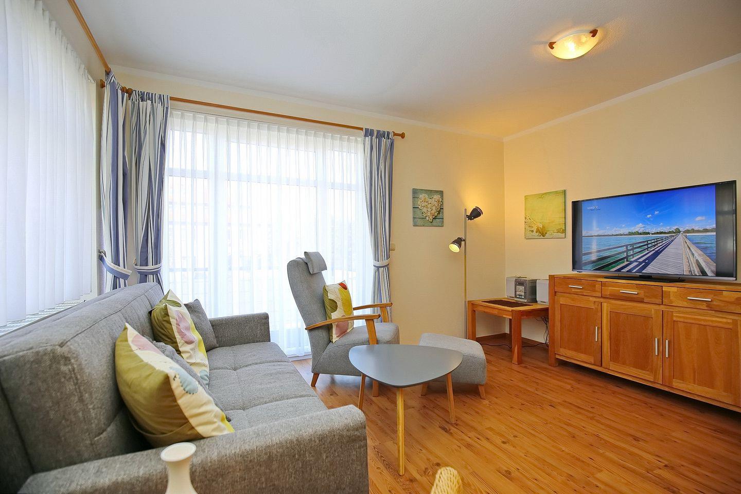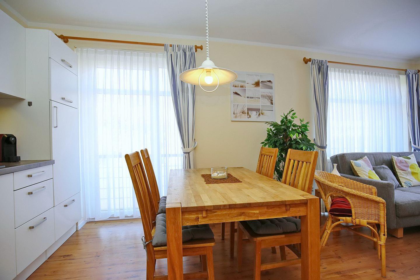 In dieser 52 m² großen, mit Laminat ausgelegten Ferienwohnung erwartet dich ein helles, freundlich ausgestattetes Wohn- und Esszimmer mit Einbauküche und Zugang zum Balkon in Richtung Ostsee, ein Schlafzimmer und ein gefliestes Duschbad. In der Wohnung sorgen moderne Farben und ein harmonischer Stil für eine gemütliche Atmosphäre. Zum Strand sind es nur ca. 100 m.