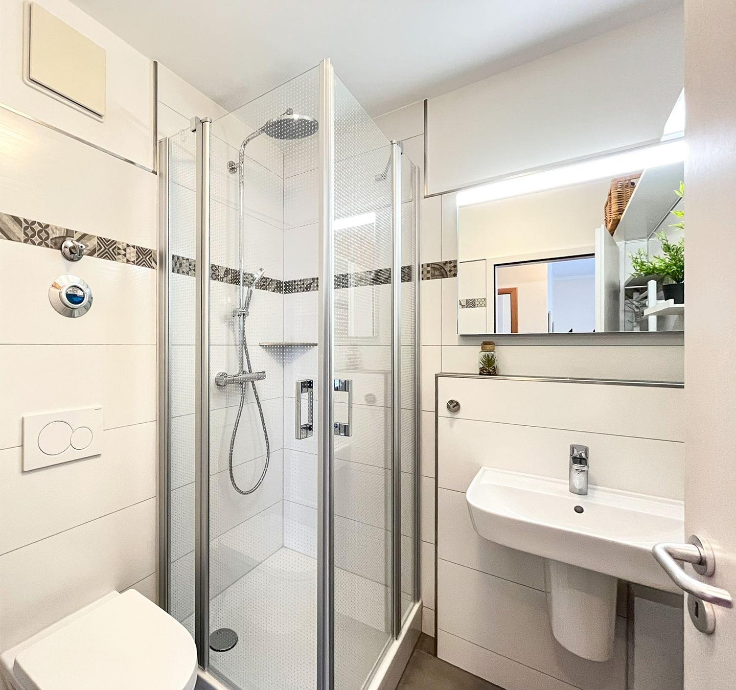 Die umfangreich ausgestattete Einbauküche beinhaltet unter anderem einen Kühlschrank mit Gefrierfach, einen Geschirrspüler, ein 4-Platten-Cerankochfeld mit Backofen, eine Dunstabzugshaube und eine Mikrowelle.