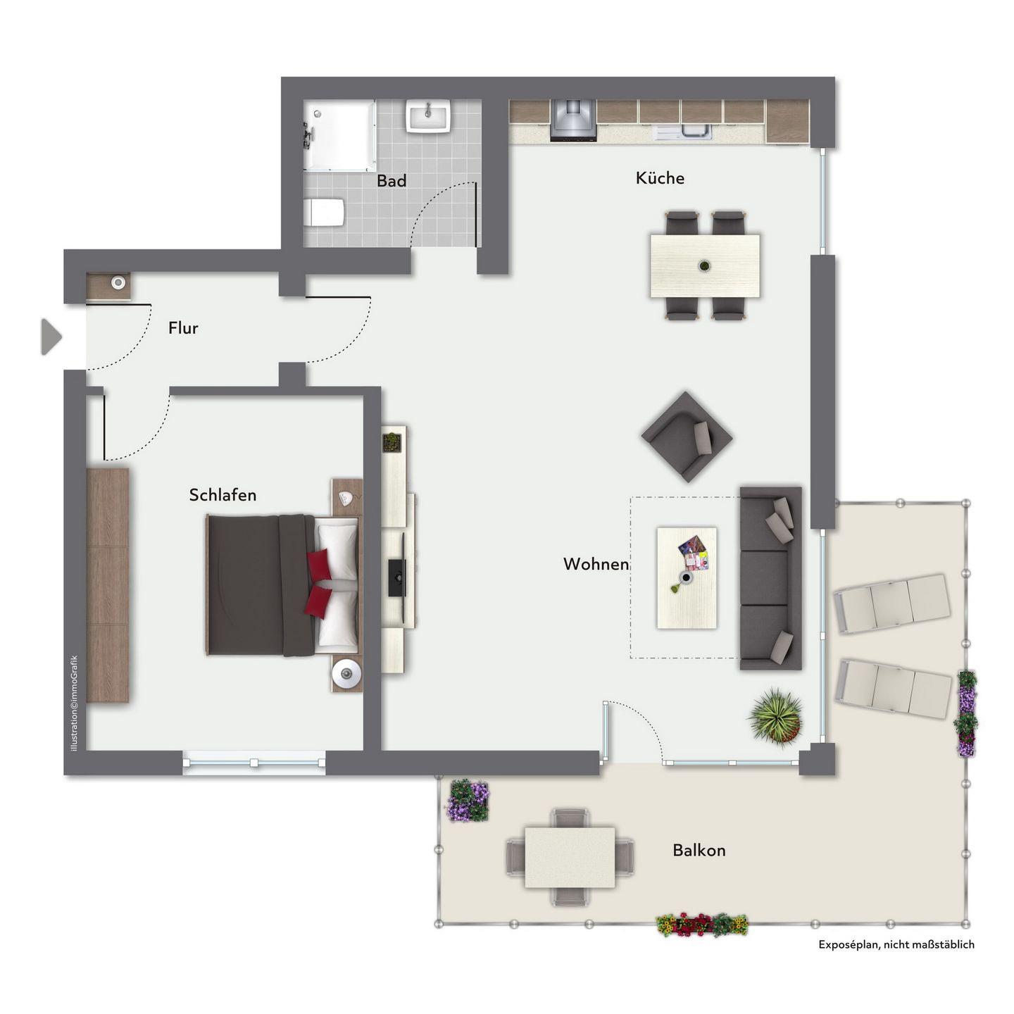 Das durch den Flur erreichbare Wohnzimmer empfängt dich mit einer Couch und zwei Sesseln, in denen du es dir gemütlich machen kannst. Ein Flachbild-TV (SKY) und eine Stereoanlage sorgen für umfangreiche Unterhaltung. Zusätzlich lassen die zahlreichen Bücher keine Langeweile aufkommen. Die moderne Esstischgarnitur am hellen Balkonfenster bietet den idealen Platz für gemeinsame Mahlzeiten.