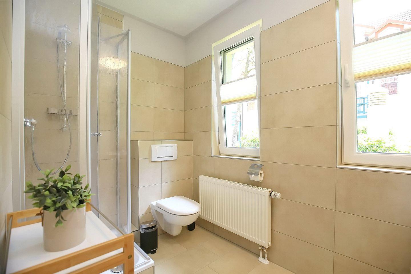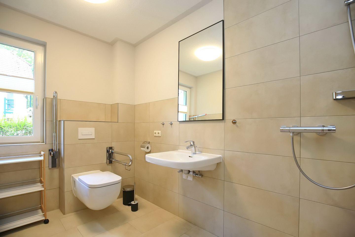 Das zweite großzügige, behindertengerechte Duschbad sorgt für dein Wohlbefinden. Beide Bäder sind mit Fliesen ausgelegt.