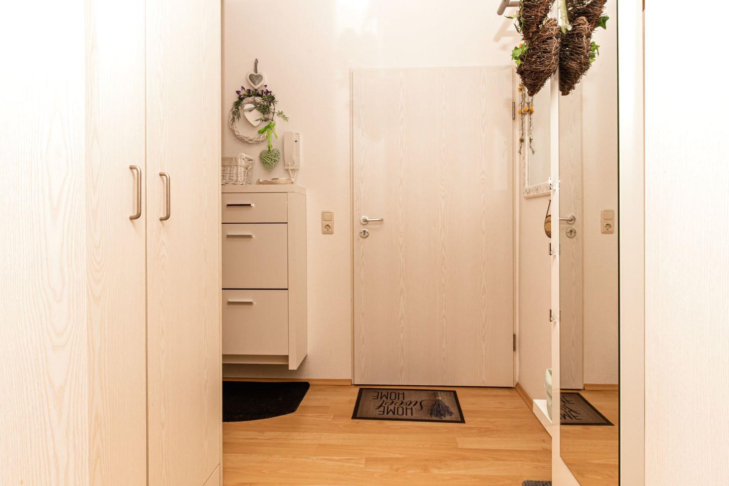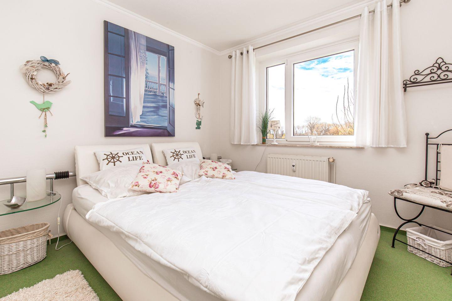 Die Wohnung besitzt ein separates Schlafzimmer mit großem Kleiderschrank und einem breiten, bequemen Doppelbett (2x 90 x 200cm). Die Wohnung ist mit Laminat ausgelegt. Vorhänge dienen als Sichtschutz.