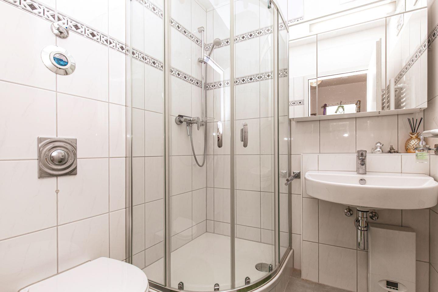 Das geflieste Duschbad ist modern eingerichtet. Neben der Dusche findest du einen Handtuchtrockner sowie ausreichend Ablagemöglichkeiten vor.