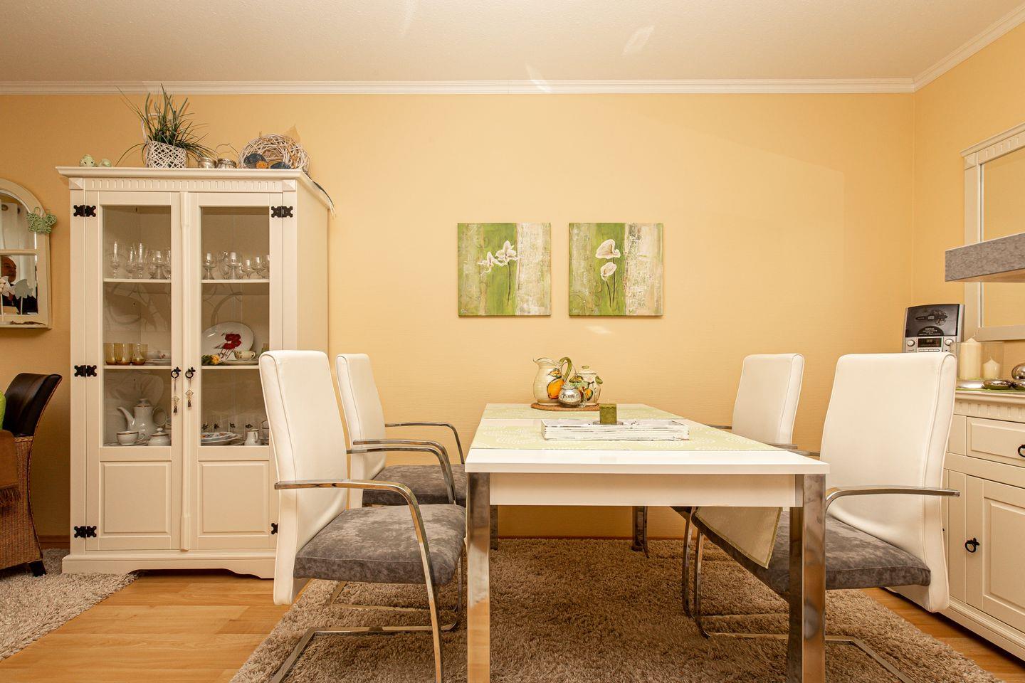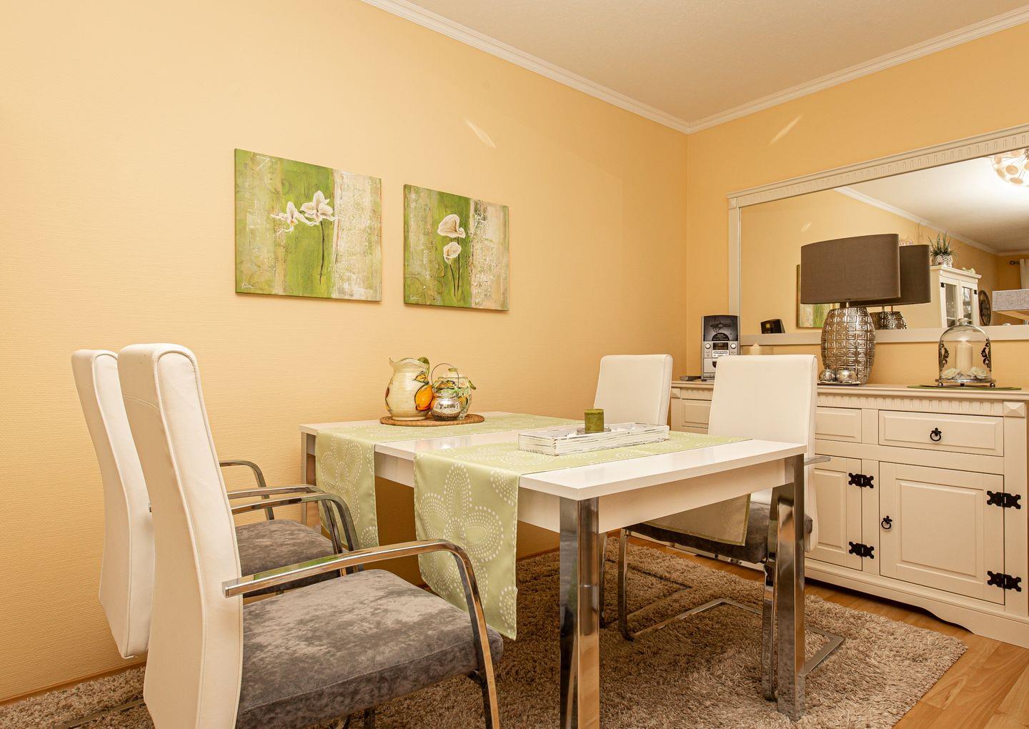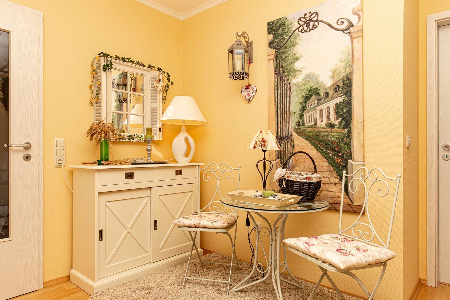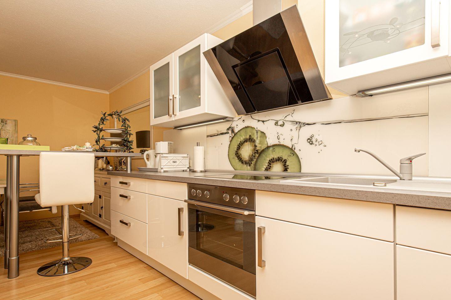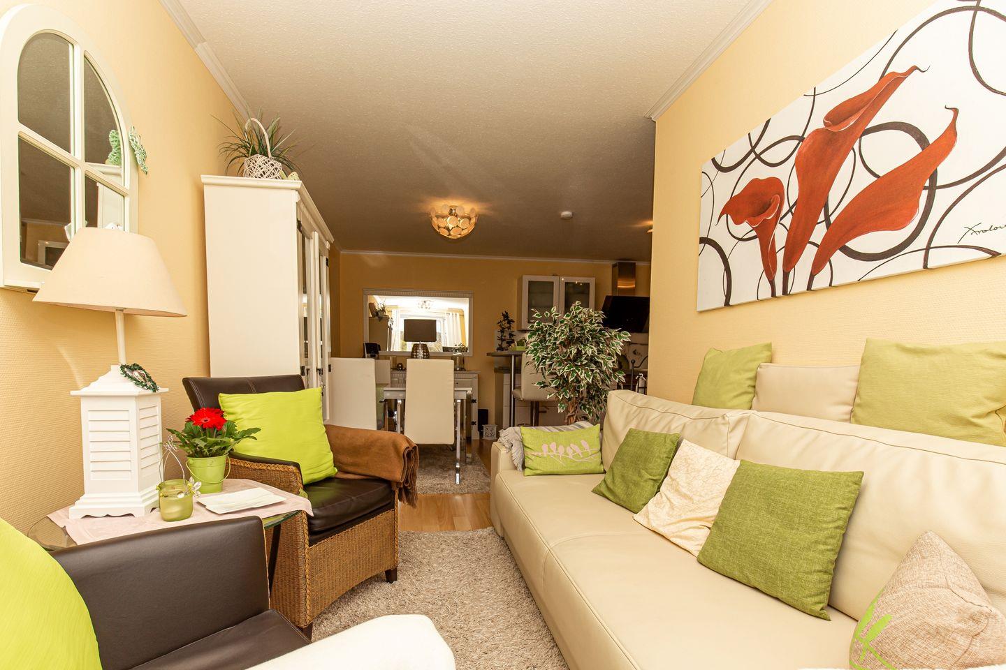 Die vorwiegend in grün/weiß gehaltene, lichtdurchflutete Wohnung ist mit viel Liebe zum Detail eingerichtet und dadurch verbreitet sie sofort schon beim Eintreten gute Laune.
