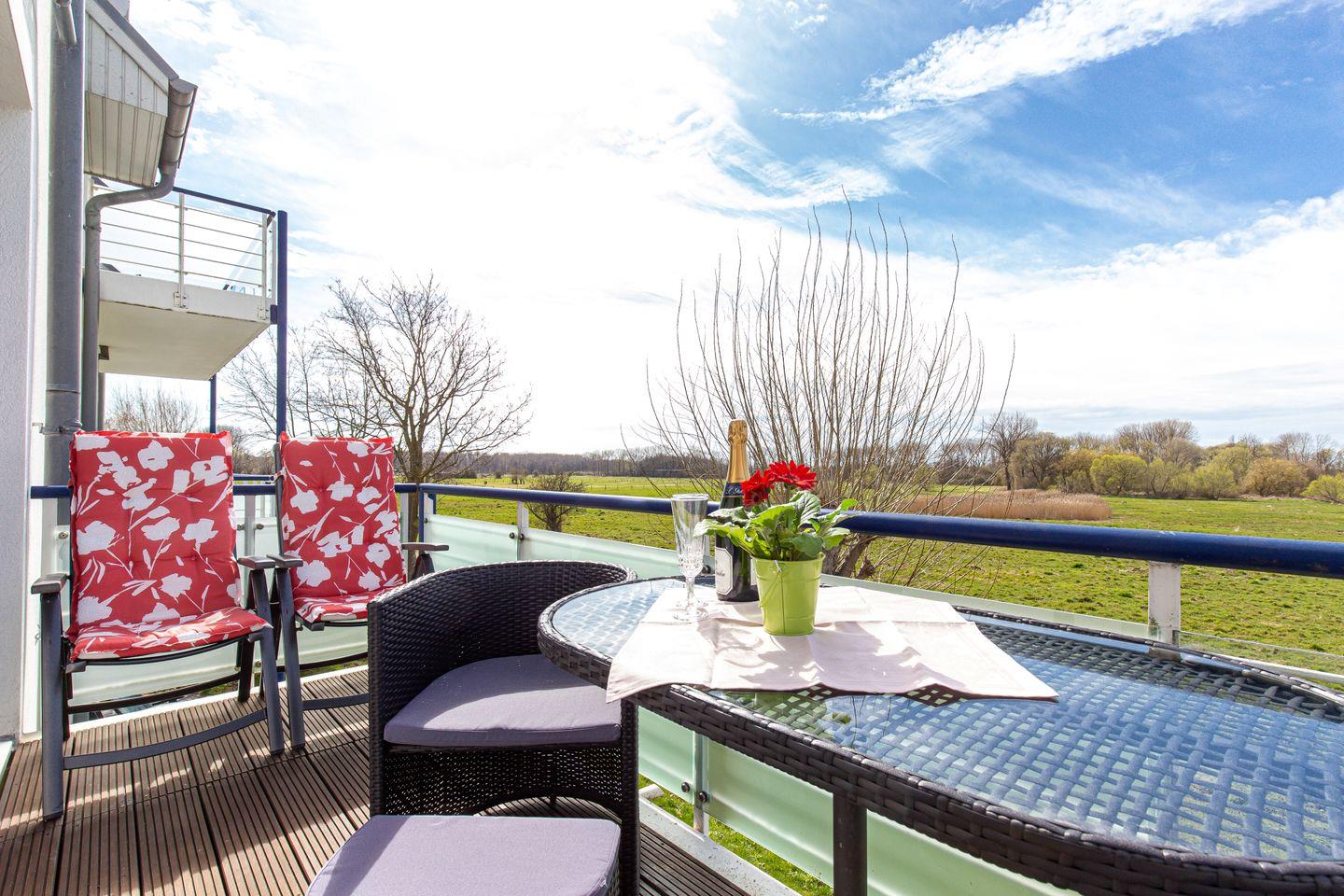 Im Wohnbereich lädt die gemütliche Couch zum Verweilen ein. Es stehen dir ein Flachbild-TV und eine Stereoanlage zur Verfügung. Die Couch ist ausziehbar. Der moderne Esstisch bietet den idealen Platz für gemeinsame Mahlzeiten. Vom Balkon aus hast du einen atemberaubend schönen Blick auf die Haffwiesen und das daran grenzende Naturschutzgebiet Tarnewitzer Urwald.