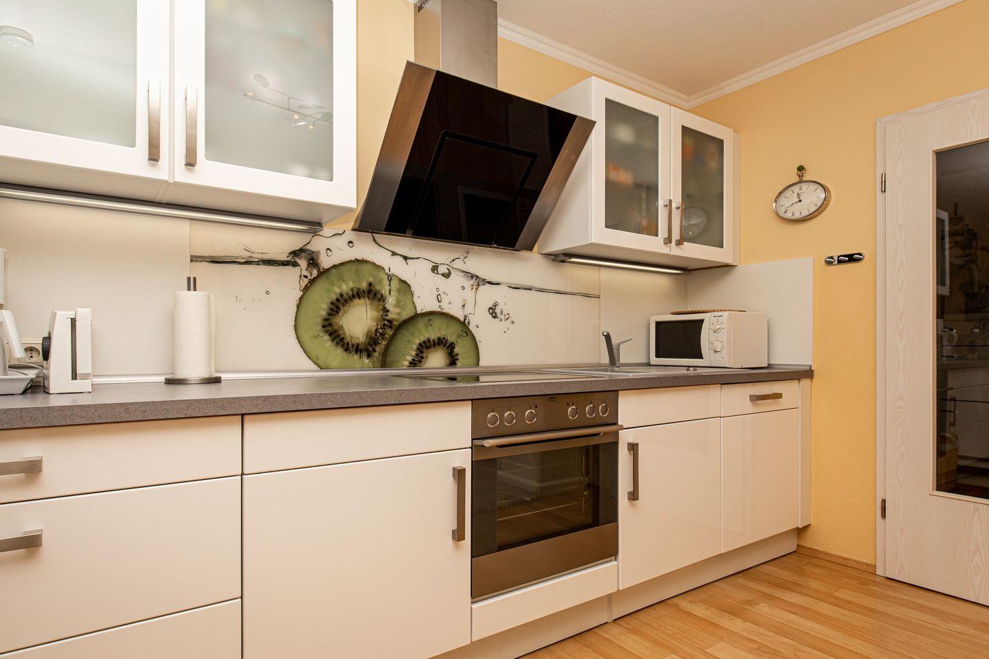 Die Küchenzeile ist im Wohnzimmer integriert und ist mit einem Kühlschrank mit Gefrierfach, Geschirrspüler, einem Backofen sowie einem 4-Platten-Cerankochfeld und Mikrowelle gut ausgestattet.