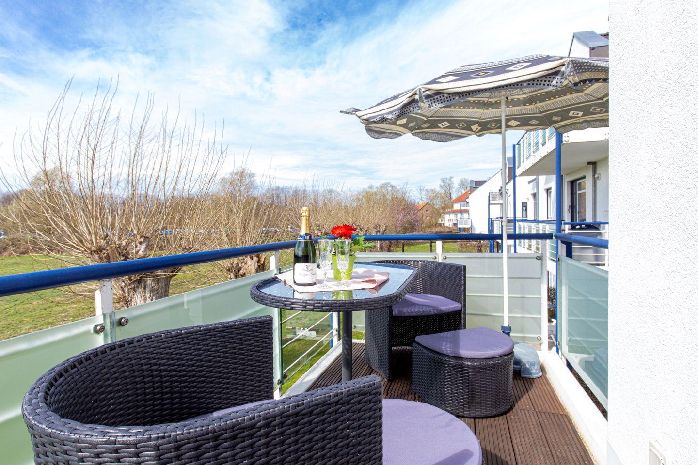 Die Ferienwohnung 60 in der Anlage Haffblick ist eine schöne 2-Zimmer-Wohnung mit 46 qm und bietet Platz für bis zu 2 Personen. Die Ferienwohnung liegt im 1. OG und hat einen Balkon in Süd-Lage. Es steht Ihnen eine Münz-Waschmaschine sowie ein Münz-Wäschetrockner zur Verfügung. WLAN (ohne Gewähr) ist verfügbar.
