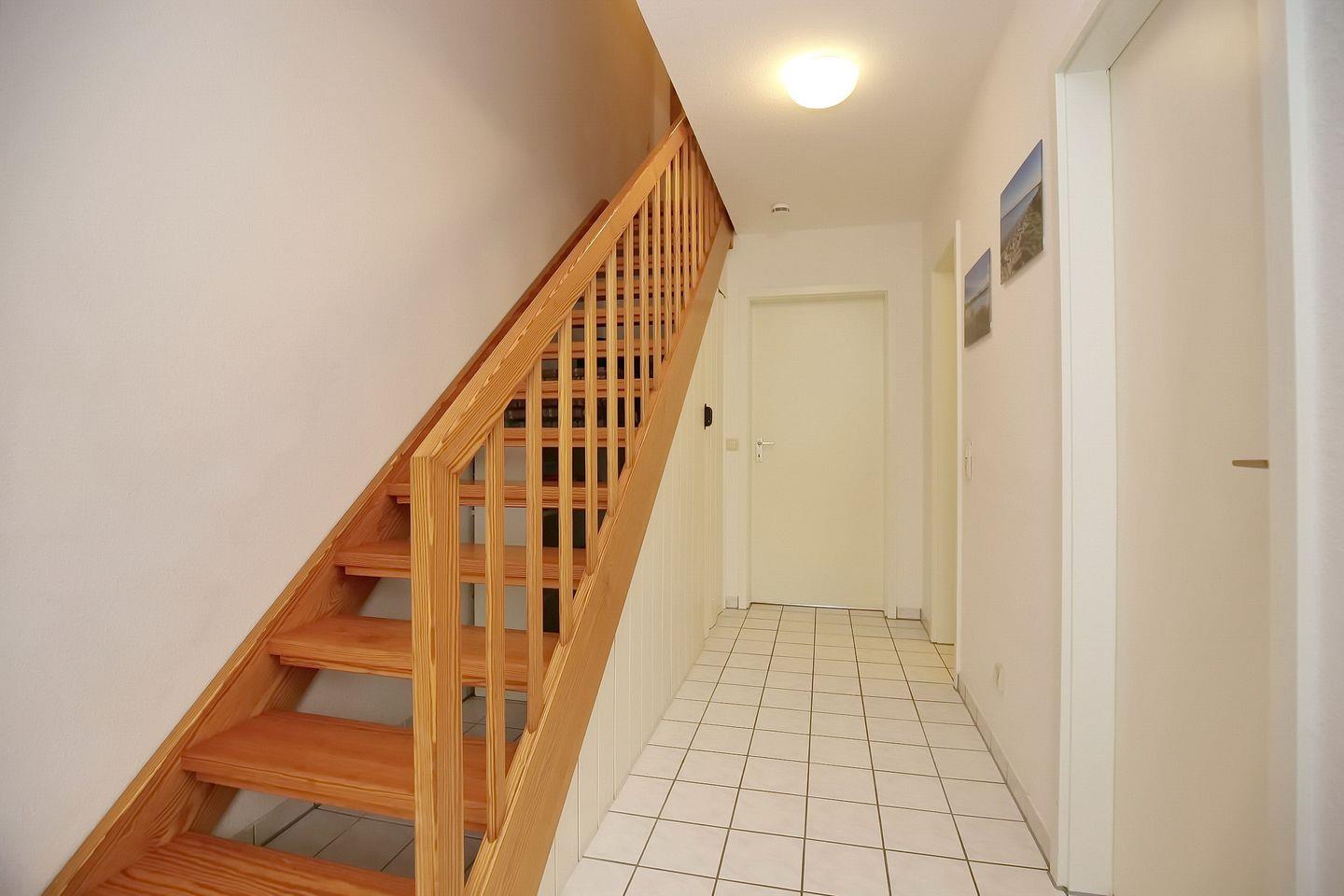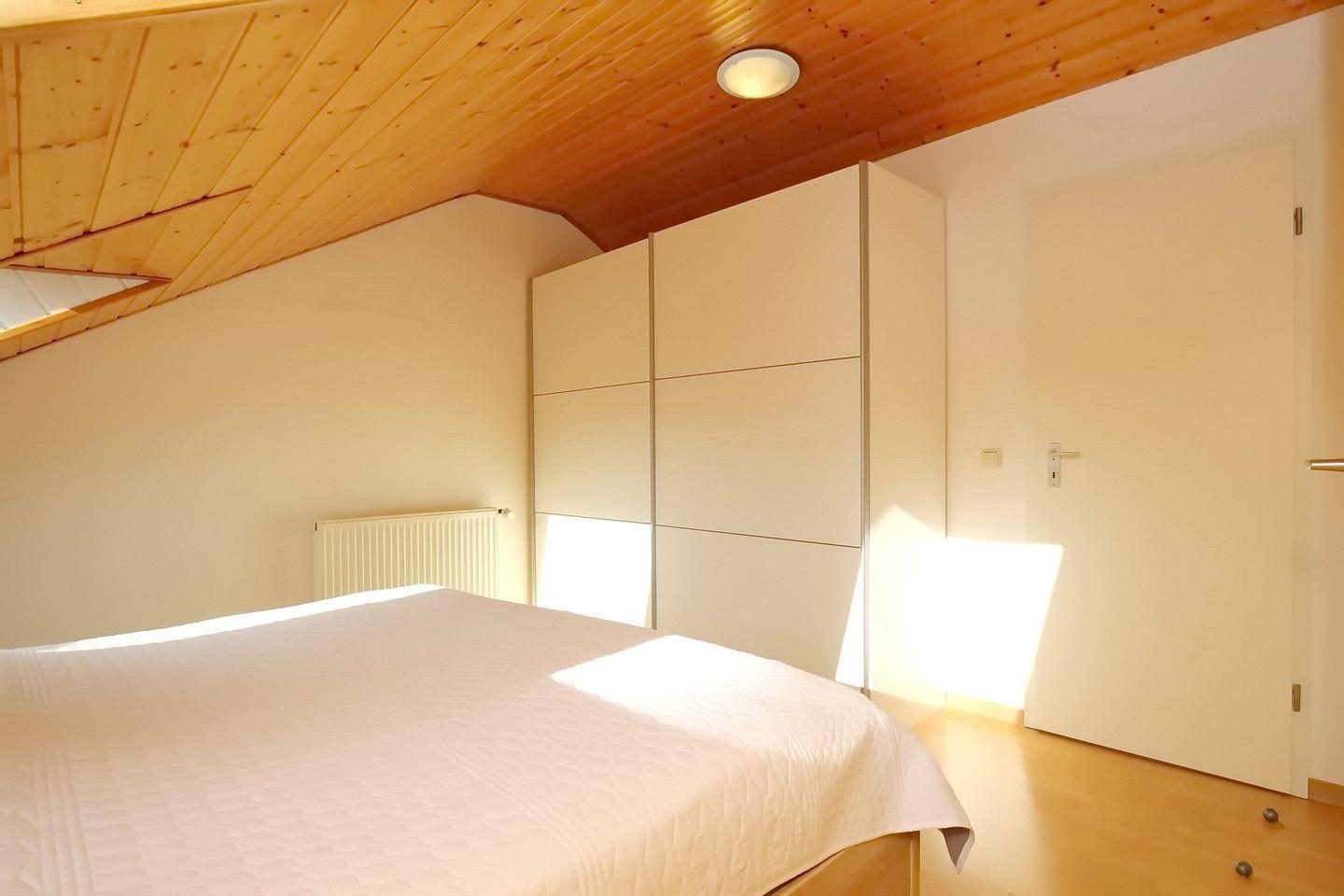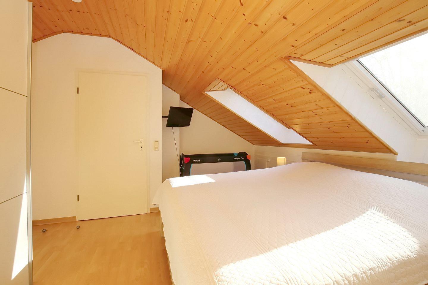 Zwei Einzelbetten (90 x 200 cm) bzw. ein großes Doppelbett (2 x 90 x 200 cm) findest du in den Schlafzimmern vor. Ein geräumiger Kleiderschrank im Obergeschoss bietet reichlich Platz für deine Urlaubsgarderobe. Ein Kinderhochstuhl und ein Kinderreisebett sind vorhanden.
