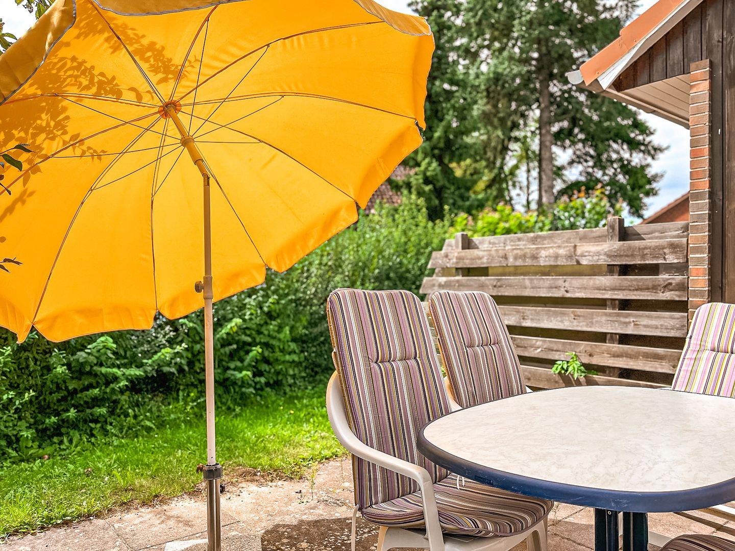 Der Wohnbereich lädt mit einem gemütlichen Sofa, das sich zur Schlafgelegenheit (Liegefläche ca. 140 x 200 cm) umbauen lässt, zum Ausruhen ein. Der große Esstisch bietet viel Platz für geselliges Miteinander. Das Wohnzimmer ist ausgestattet mit Flachbild-TV, einem Radio sowie einem CD-Player. Für wohlige Wärme sorgt der Kamin. Das Ferienhaus verfügt über eine schöne Südterrasse. Gartenstühle mit Auflagen sind vorhanden.