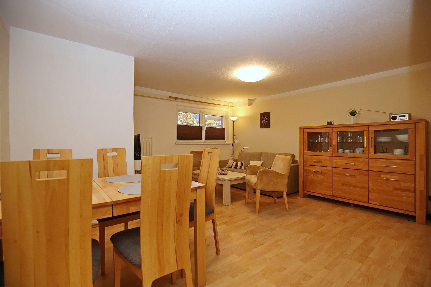 Im Wohnzimmer sorgen ein Sofa, zwei Sessel sowie ein Esstisch für vier Personen für Gemütlichkeit. Zum Zeitvertreib dient ein Flachbild-TV sowie ein Radio.