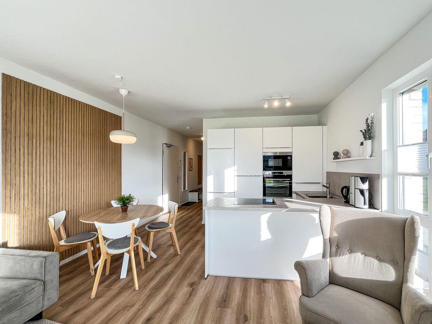 Deine ca. 69 m² große Ferienwohnung ist modern eingerichtet. Du verfügst über ein Wohnzimmer, eine Küche, zwei Schlafzimmer, ein Badezimmer sowie eine Terrasse. In der gesamten Wohnung wurde ein Vinylbelag verlegt. Das Badezimmer ist gefliest. Die Strandentfernung beträgt ca. 200 Meter.