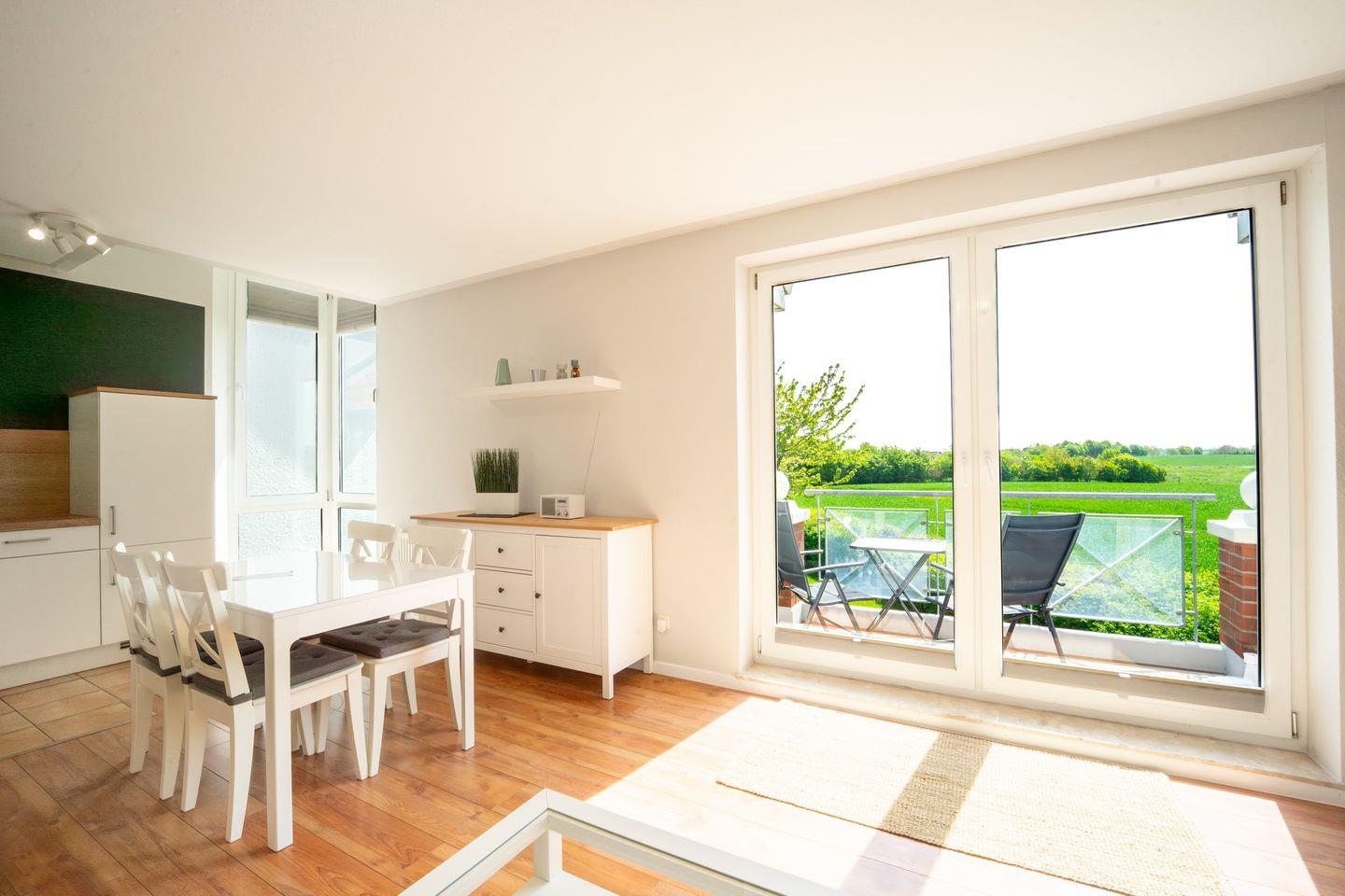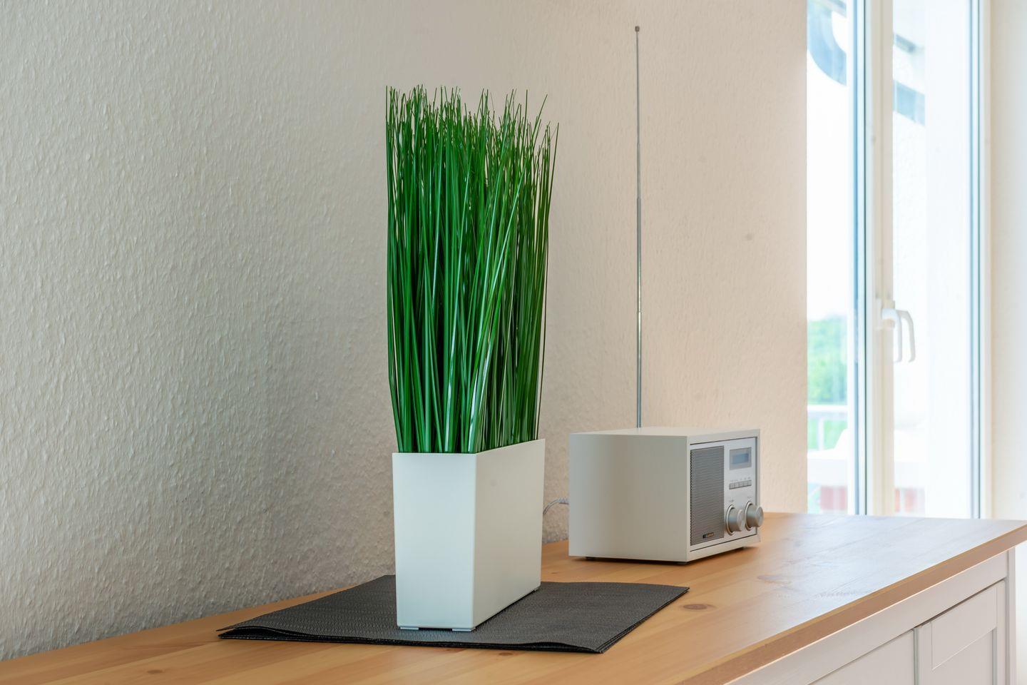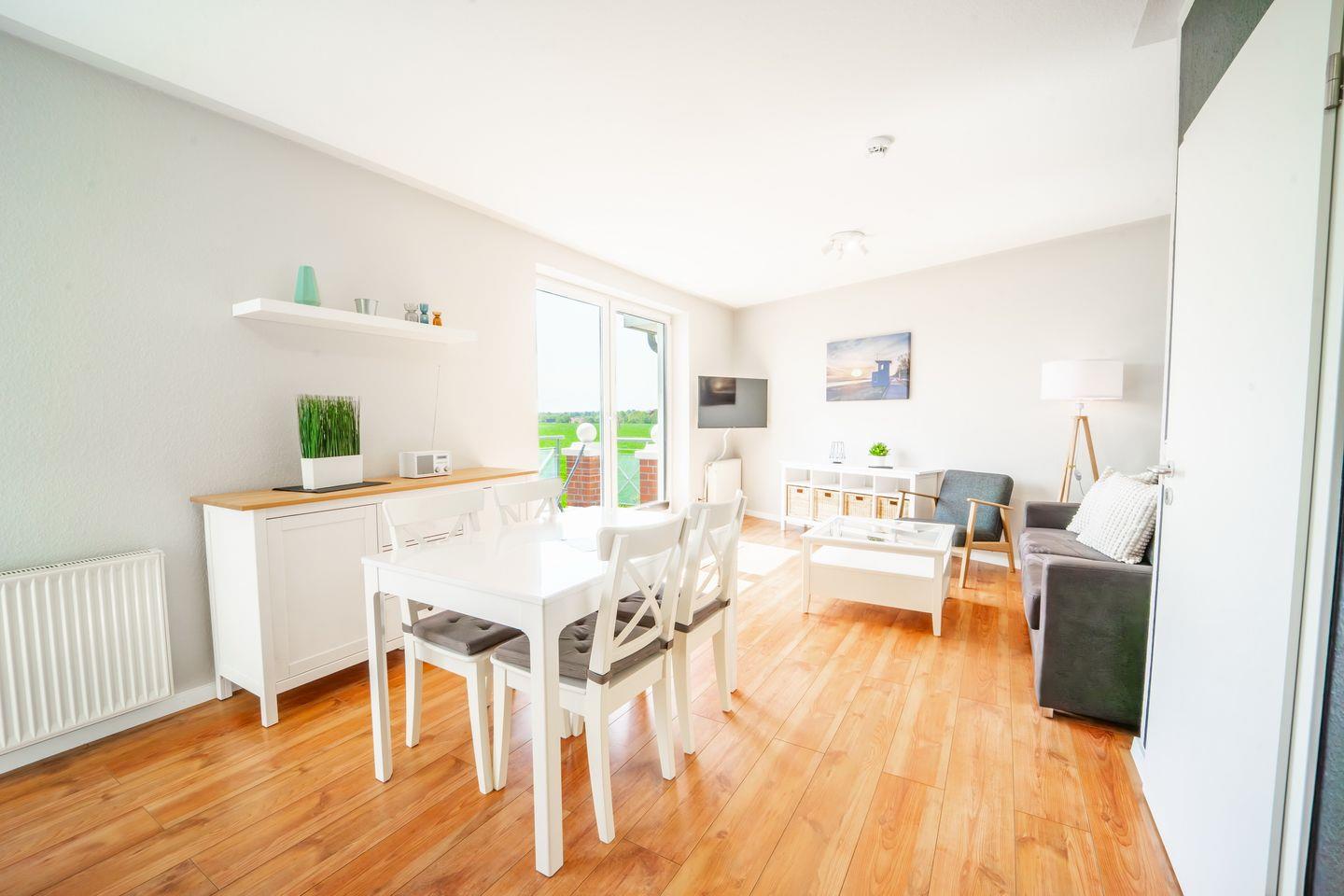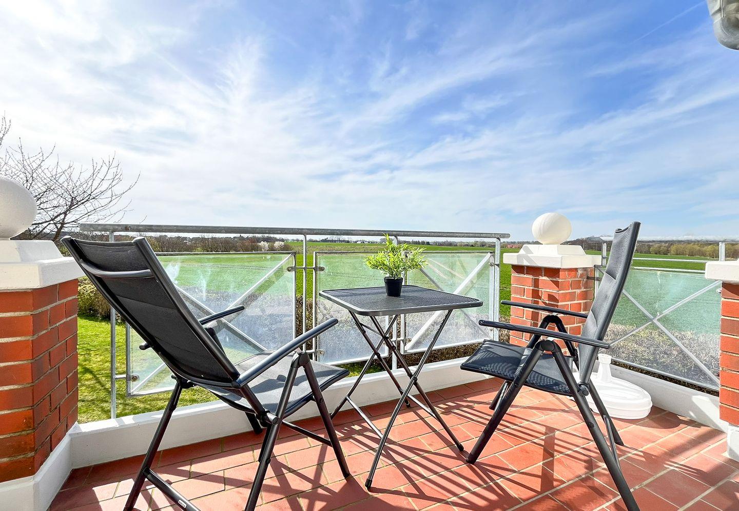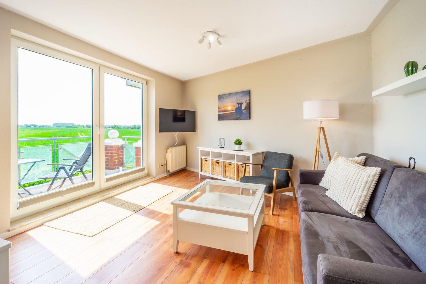 Über den Wohnbereich gelangst du auf den möblierten Balkon. Im Wohnzimmer kannst du auf dem Sofa gemütliche Abende verbringen. Zum Zeitvertreib dienen ein Flachbild-TV und eine Radio.