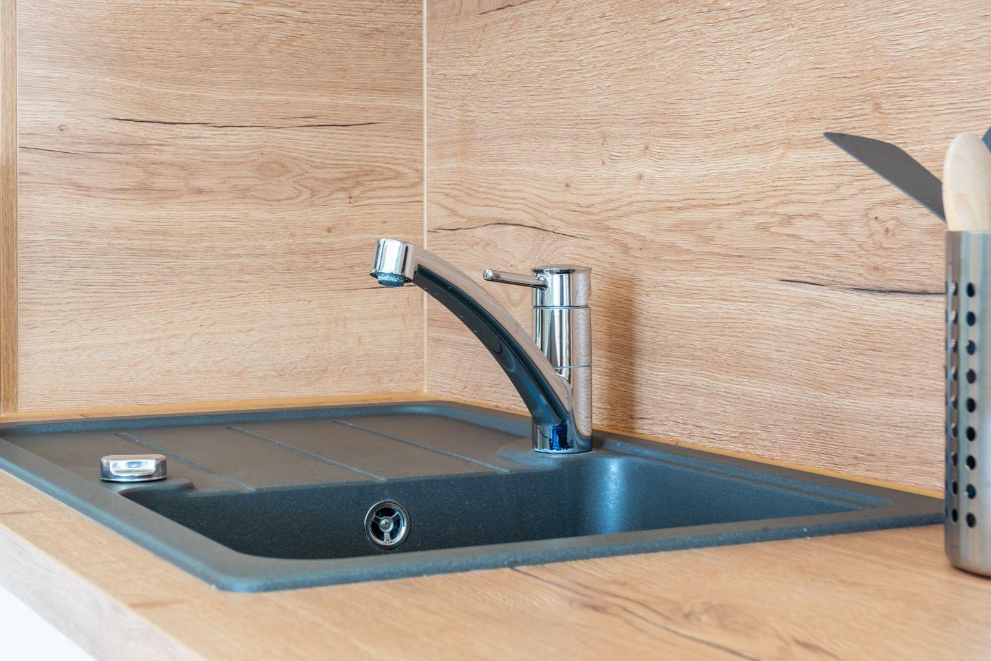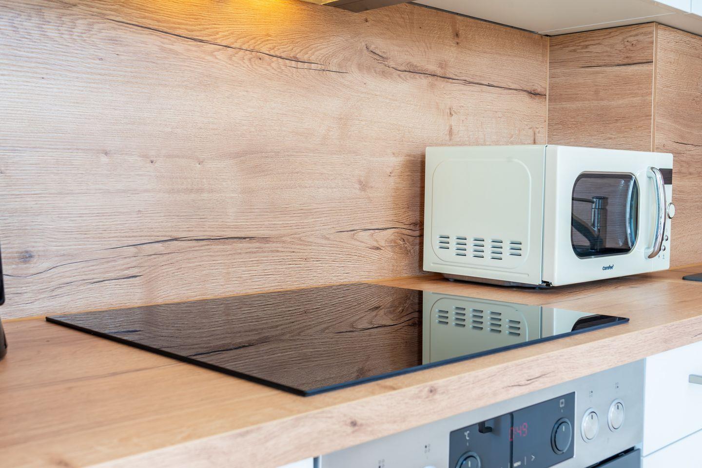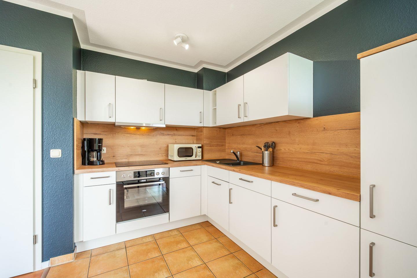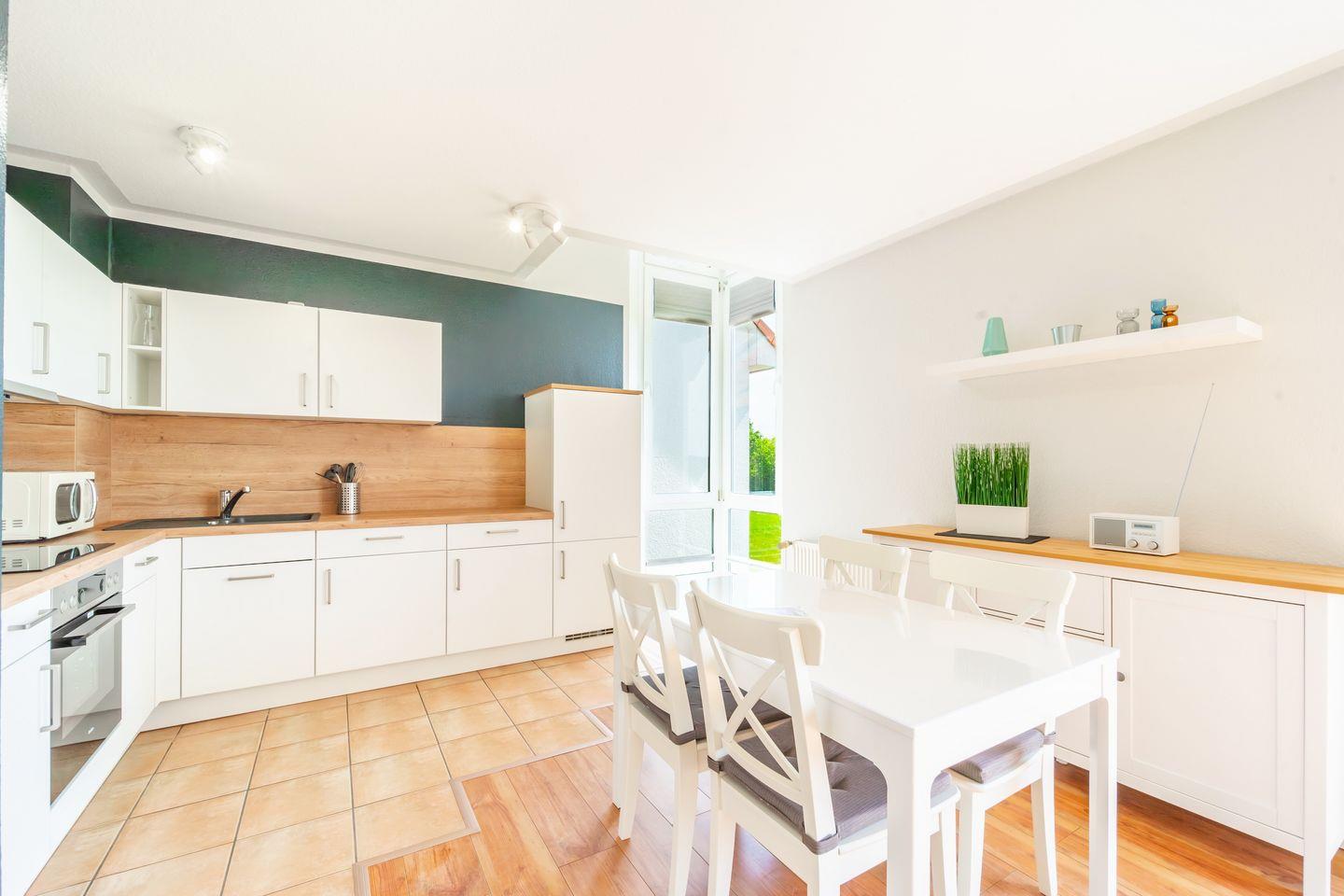 In der im Wohnbereich integrierten Küche sind eine Mikrowelle, Geschirrspüler, ein 4-Cerankochfeld mit Backofen und ein Kühlschrank mit Gefrierfach vorhanden. Am Esstisch können sich alle zum gemeinsamen Essen zusammenfinden. Der Boden ist in der gesamten Wohnung mit Laminat bzw. Vinyl ausgelegt. Die Küche und das Bad sind gefliest.