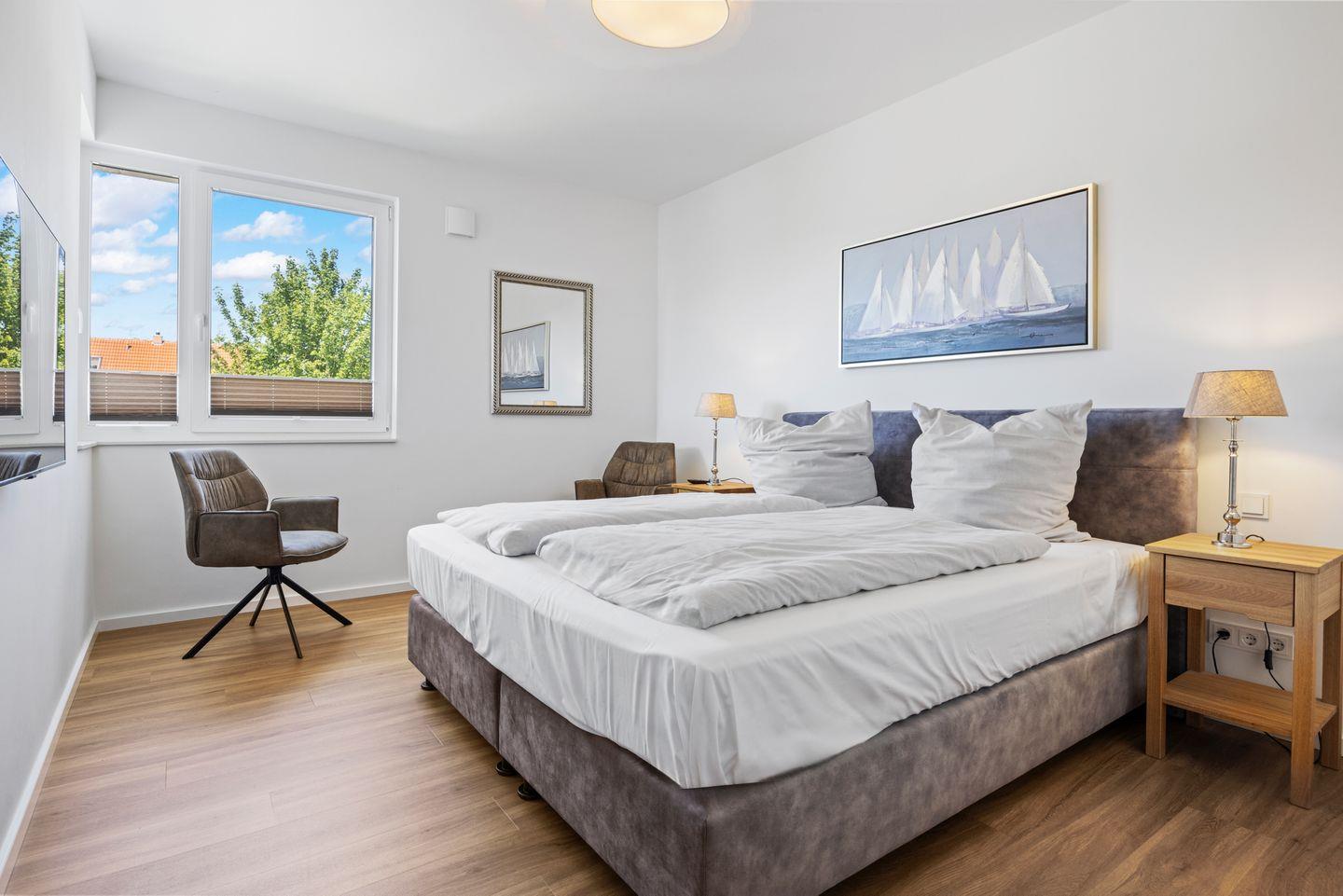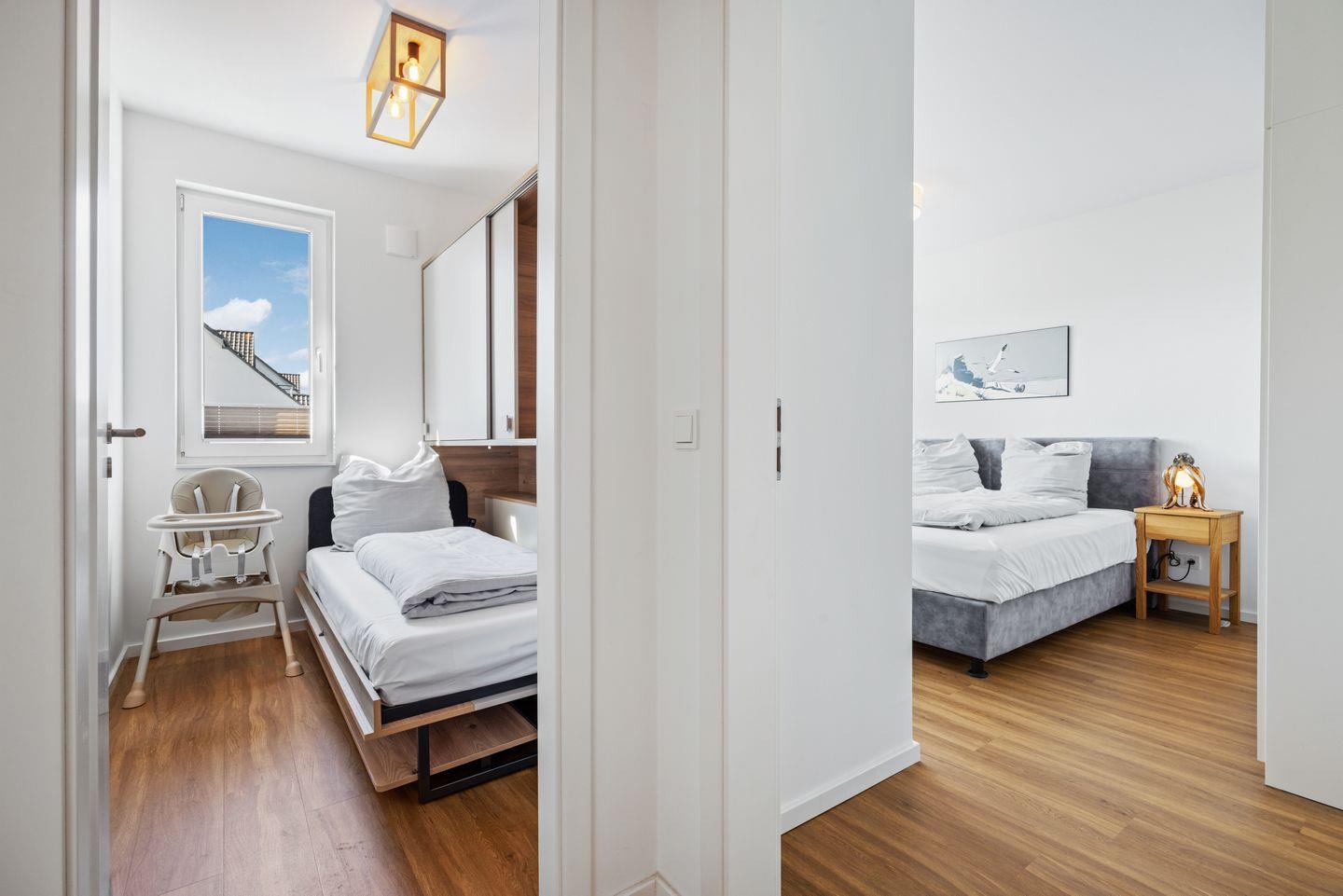 Zwei separate Schlafzimmer sind jeweils mit einem modernen Boxspringbett (1,80 x 2,00 m), SMART-TV (43 Zoll) und Kleiderschrank ausgestattet. Das dritte Schlafzimmer verfügt über ein Schrankbett (0,90 x 2,00 m) mit einer Schlafmöglichkeit für eine fünfte Person. Ein Kinderbett kann gegen Entgelt in den Schlafzimmern aufgestellt werden. Ein Kinderhochstuhl ist im Apartment vorhanden.