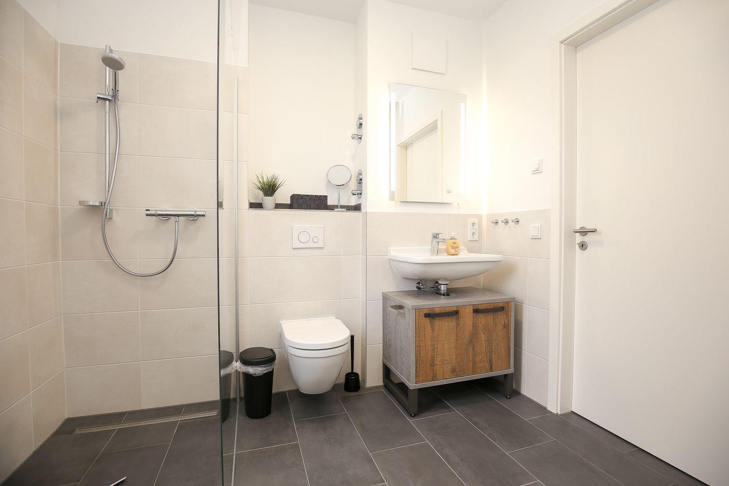 Das modern geflieste Badezimmer ist mit einer bodengleichen Dusche, WC und Waschtisch ausgestattet.