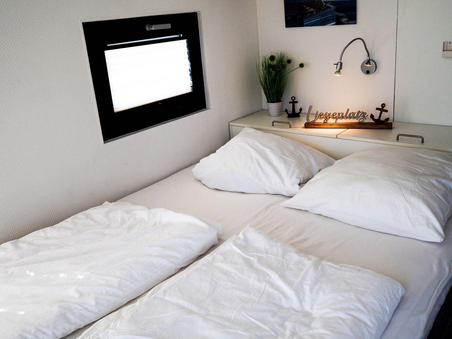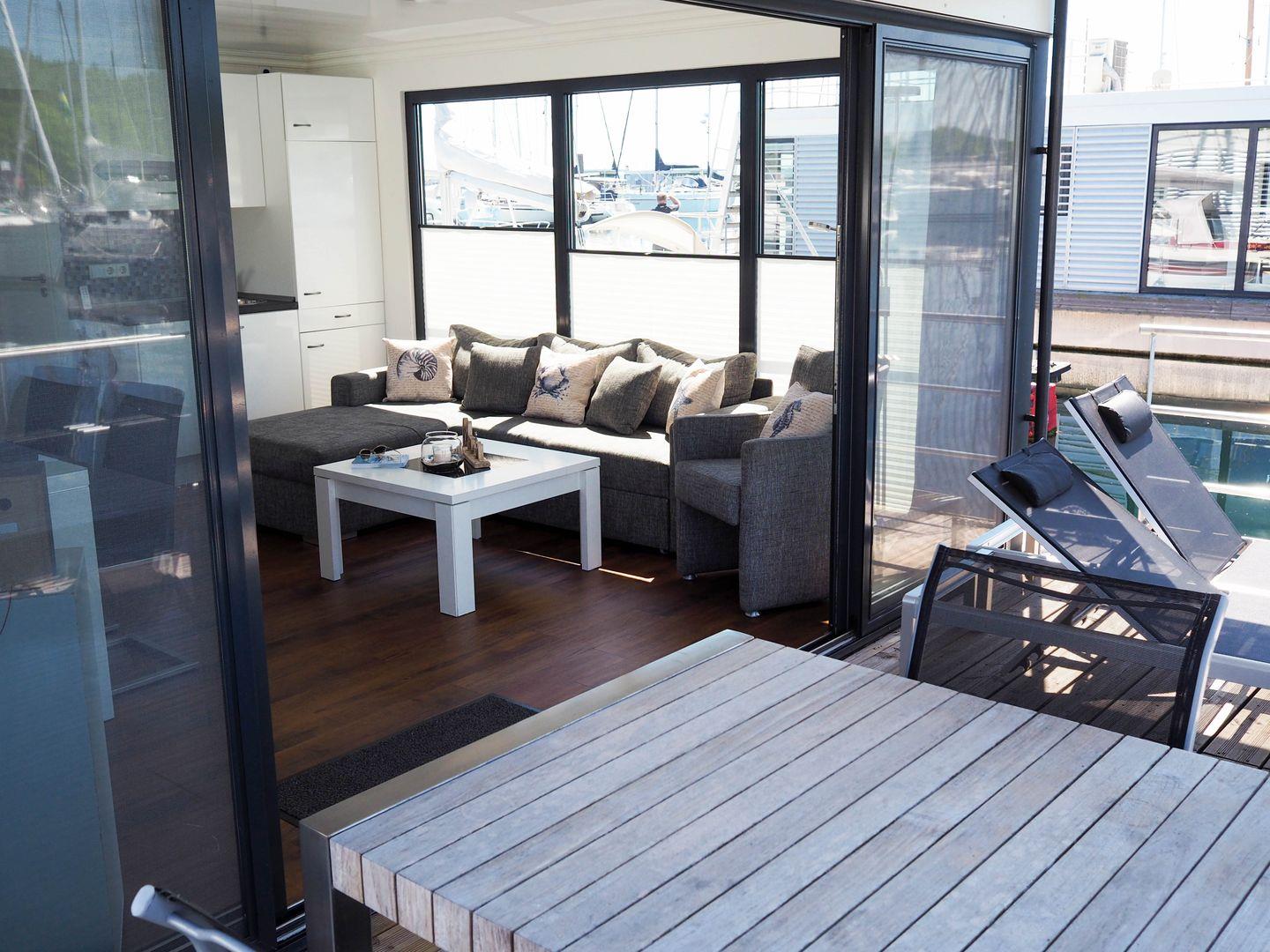 Sie verfügen über einen großzügigen Wohnbereich mit integrierter, gut-ausgestatteter Küchenzeile und direktem Zugang zur 15 qm großen Terrasse am Bug, sowie zwei Schlafzimmern.