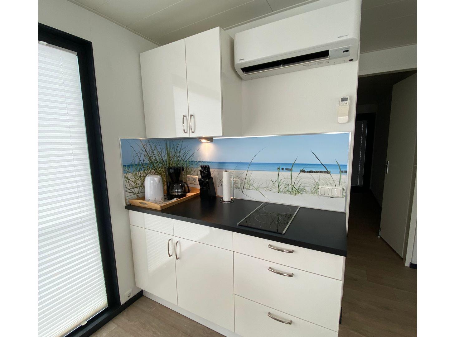 Mikrowelle, Spülmaschine, Kühlschrank, Kaffeemaschine, Toaster, Wasserkocher, Spüle, (Die Küche ist in den Wohnbereich integriert).