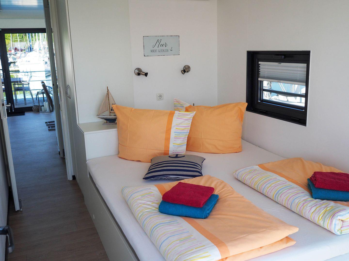 Sie verfügen über einen großzügigen Wohnbereich mit integrierter, gut-ausgestatteter Küchenzeile und direktem Zugang zur 15 qm großen Terrasse am Bug, sowie zwei Schlafzimmern.