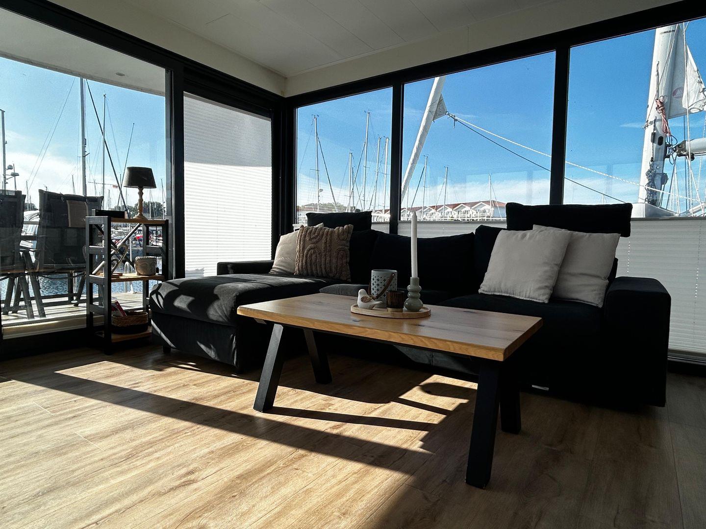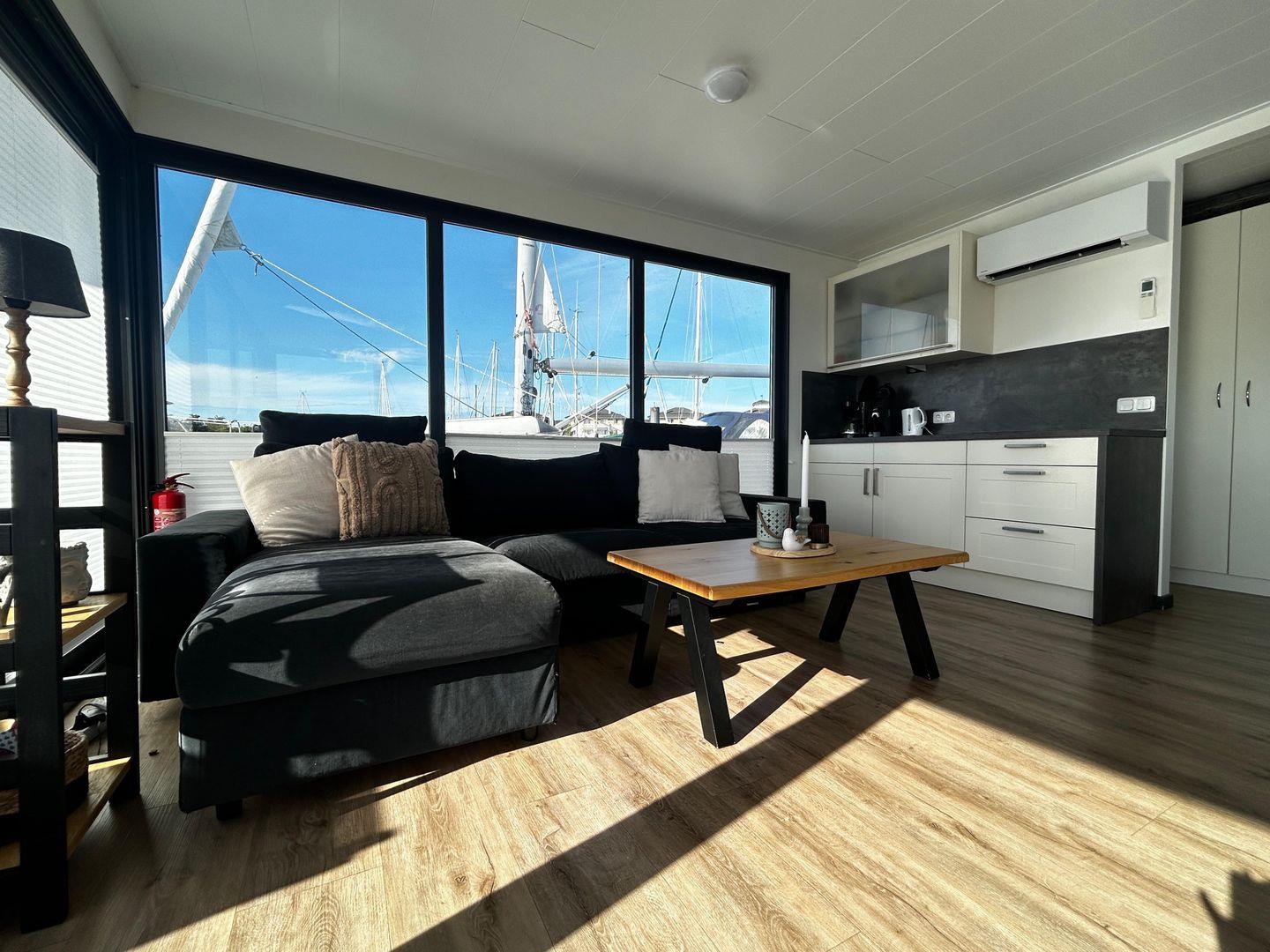 Sie verfügen über einen großzügigen Wohnbereich mit integrierter, gut-ausgestatteter Küchenzeile und direktem Zugang zur 15 qm großen Terrasse am Bug, sowie zwei Schlafzimmern.