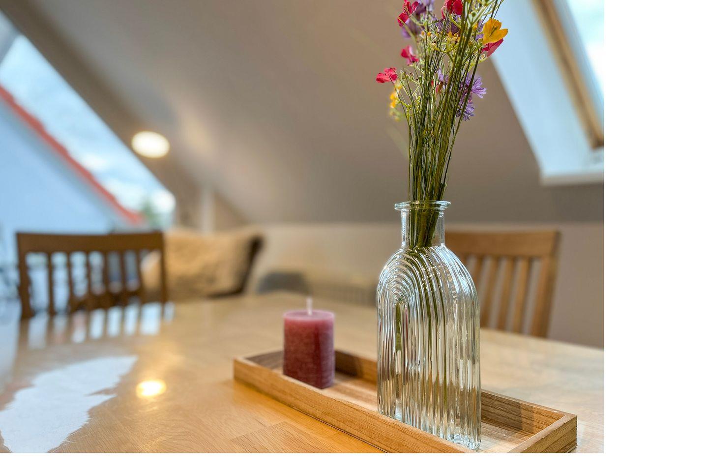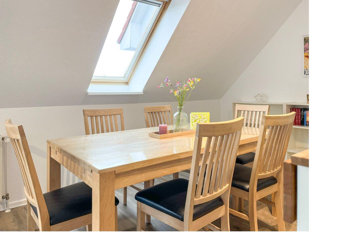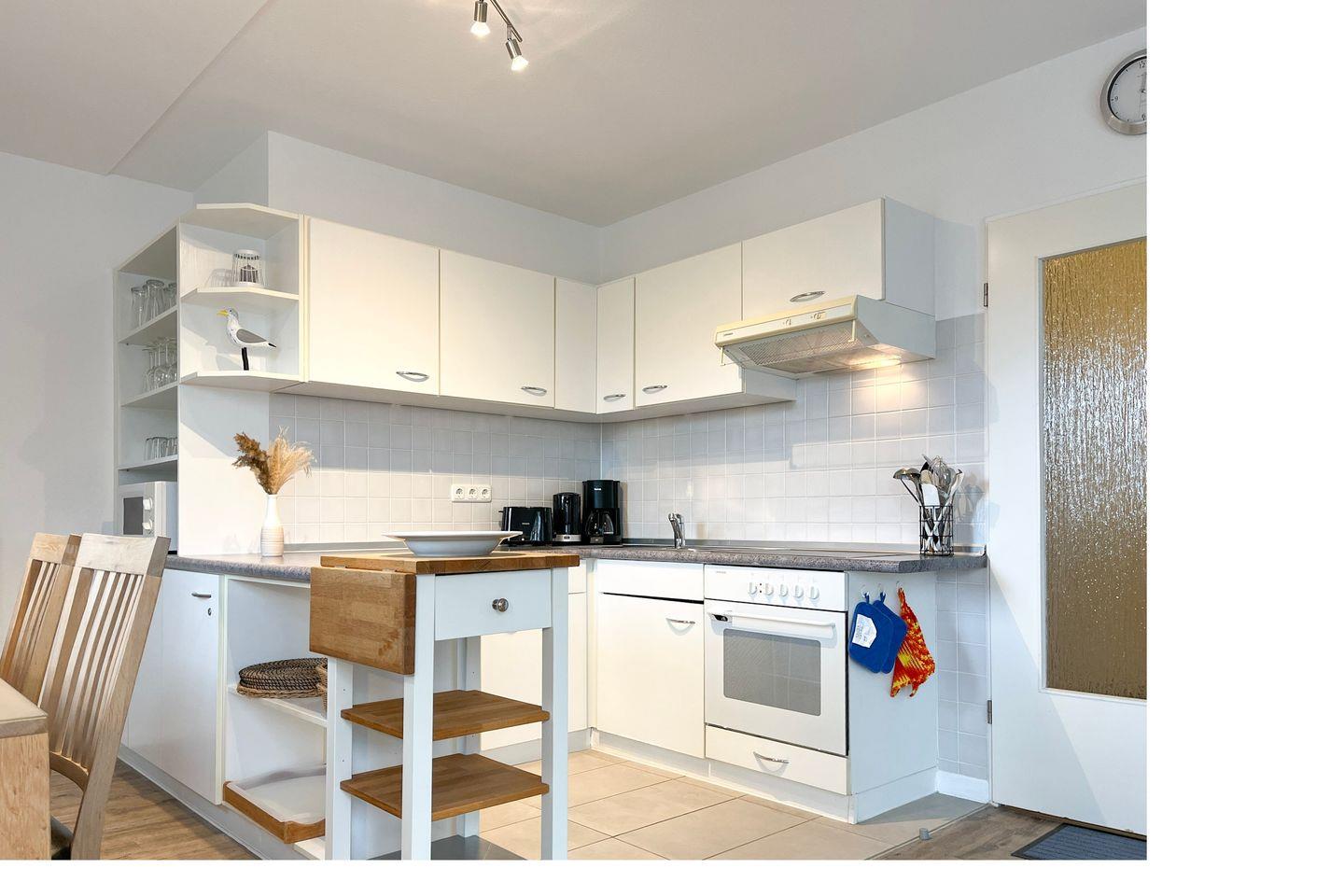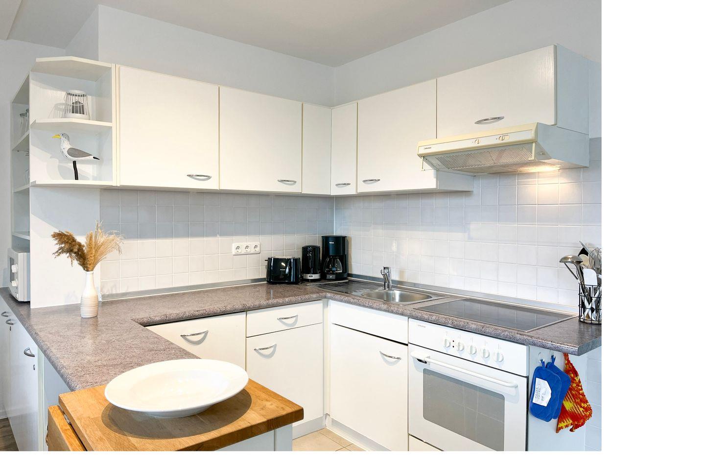 In der gefliesten Küchenzeile stehen dir ein Geschirrspüler, ein 4-Platten-Cerankochfeld mit Backofen, eine Mikrowelle, ein Kühlschrank mit Tiefkühlfach und vieles mehr zur Verfügung. Der gemütliche Essplatz befindet sich in der Nähe der Küchenzeile. Für kleine Gäste steht ein Hochstuhl bereit.