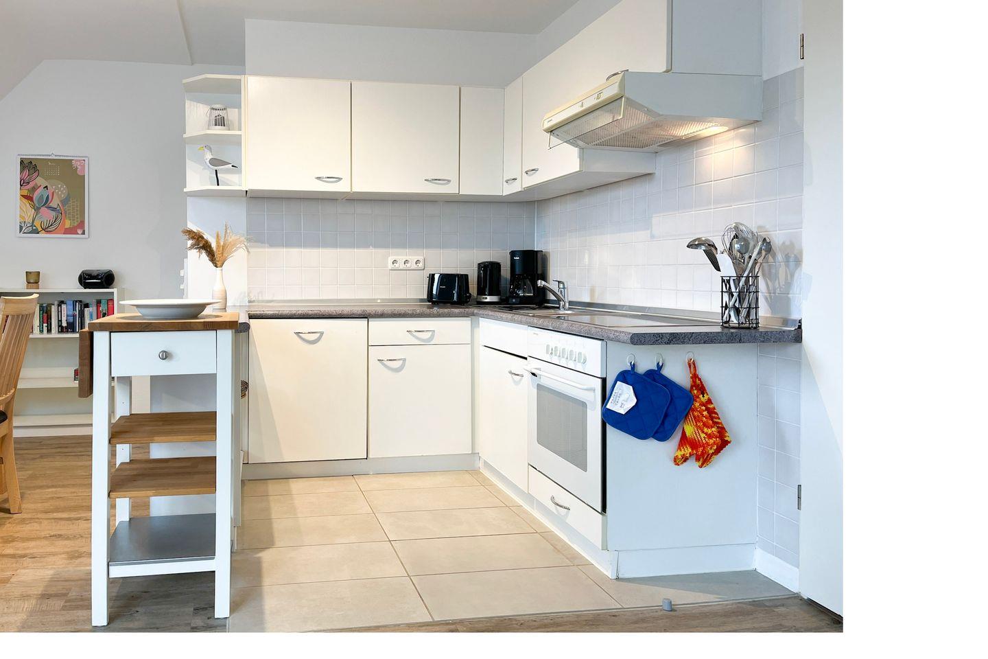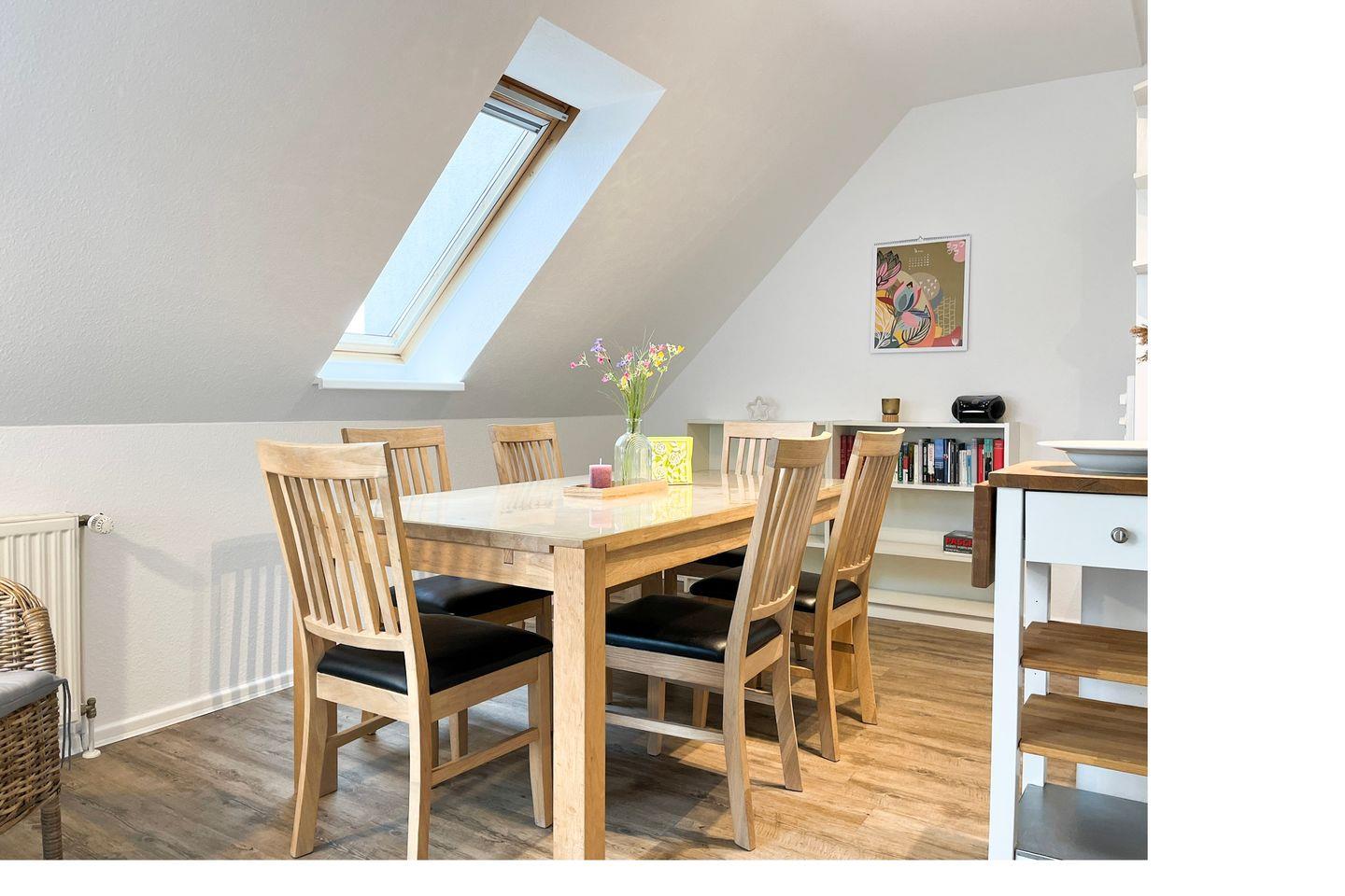 Die großzügige, ca. 68 m² große Wohnung verläuft über zwei Ebenen und bietet dir ein Wohnzimmer mit Küchenzeile und Essbereich, 2 Schlafzimmer, 1 Bad und einen West-Balkon. Zum Strand sind es nur 70 Meter.