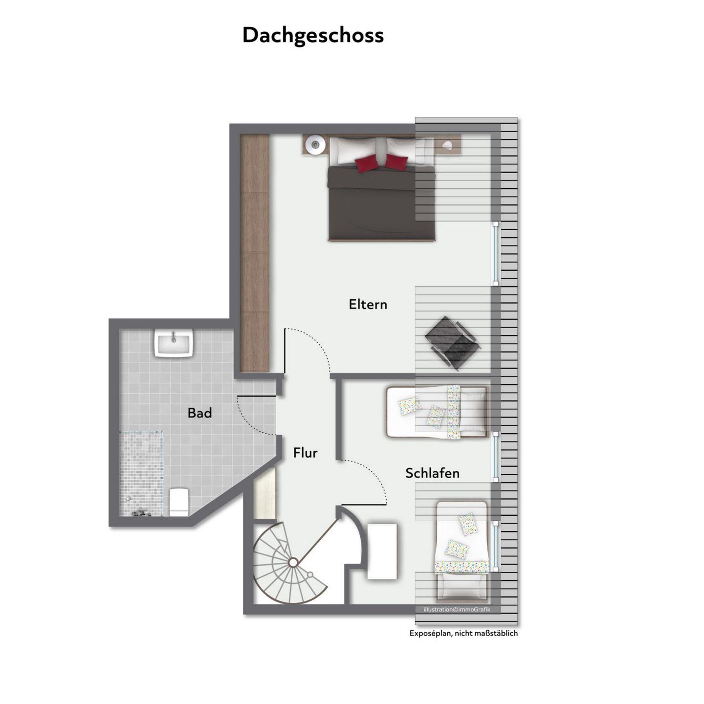 Die obere Ebene erreichst du über eine Wendeltreppe. Hier befinden sich zwei Schlafzimmer, die mit Vinyl ausgelegt sind. Im ersten Schlafzimmer verspricht ein Doppelbett (2 x 90 x 200 cm) erholsamen Schlaf. Ein großzügiger Kleiderschrank bietet viel Platz für deine Urlaubsgarderobe. Das zweite Schlafzimmer verfügt über zwei Einzelbetten (90 x 200 cm).Ein Kinderreisebett ist auch vorhanden.