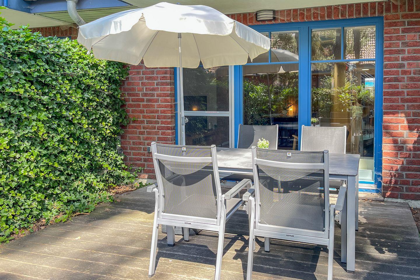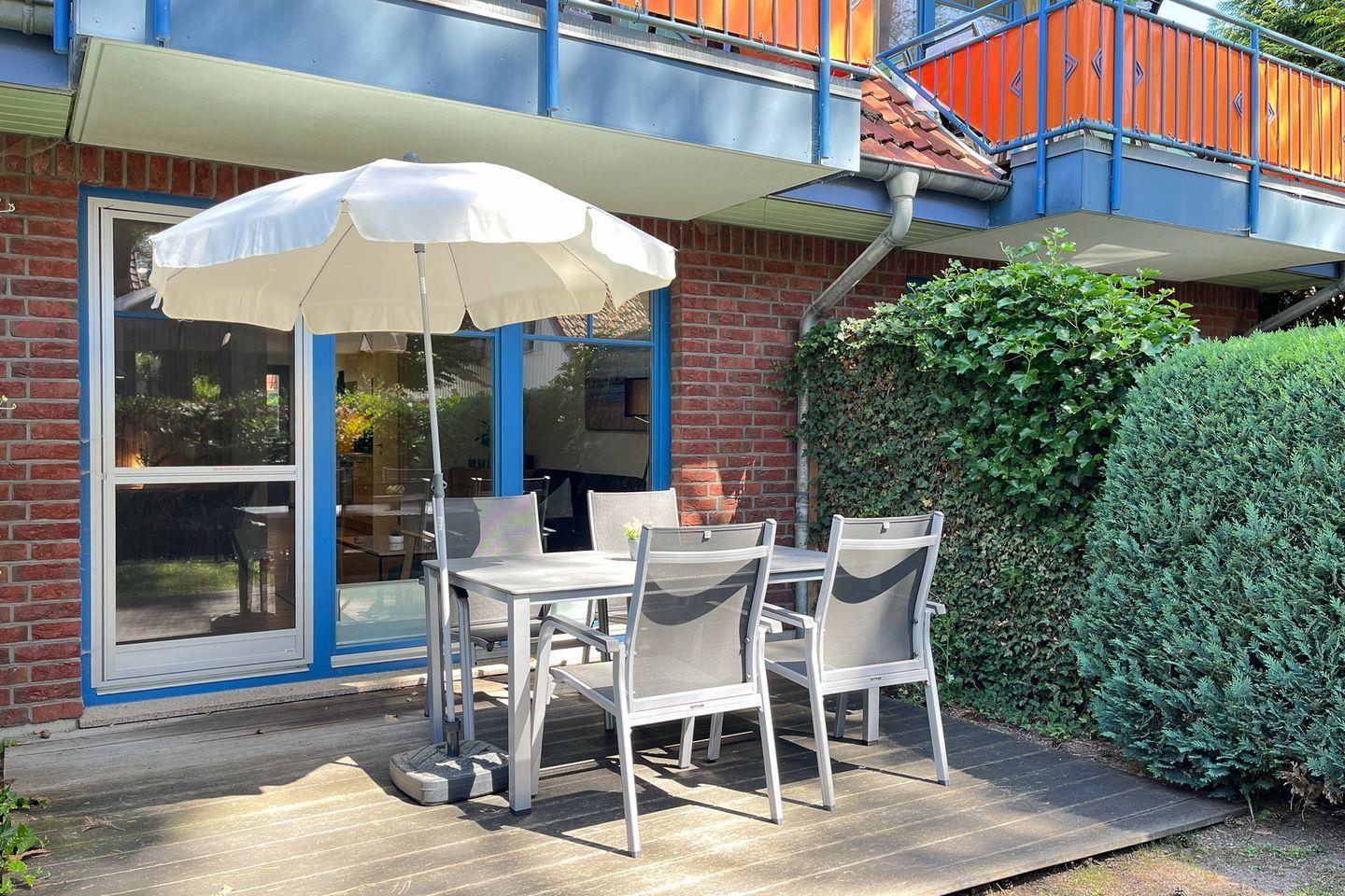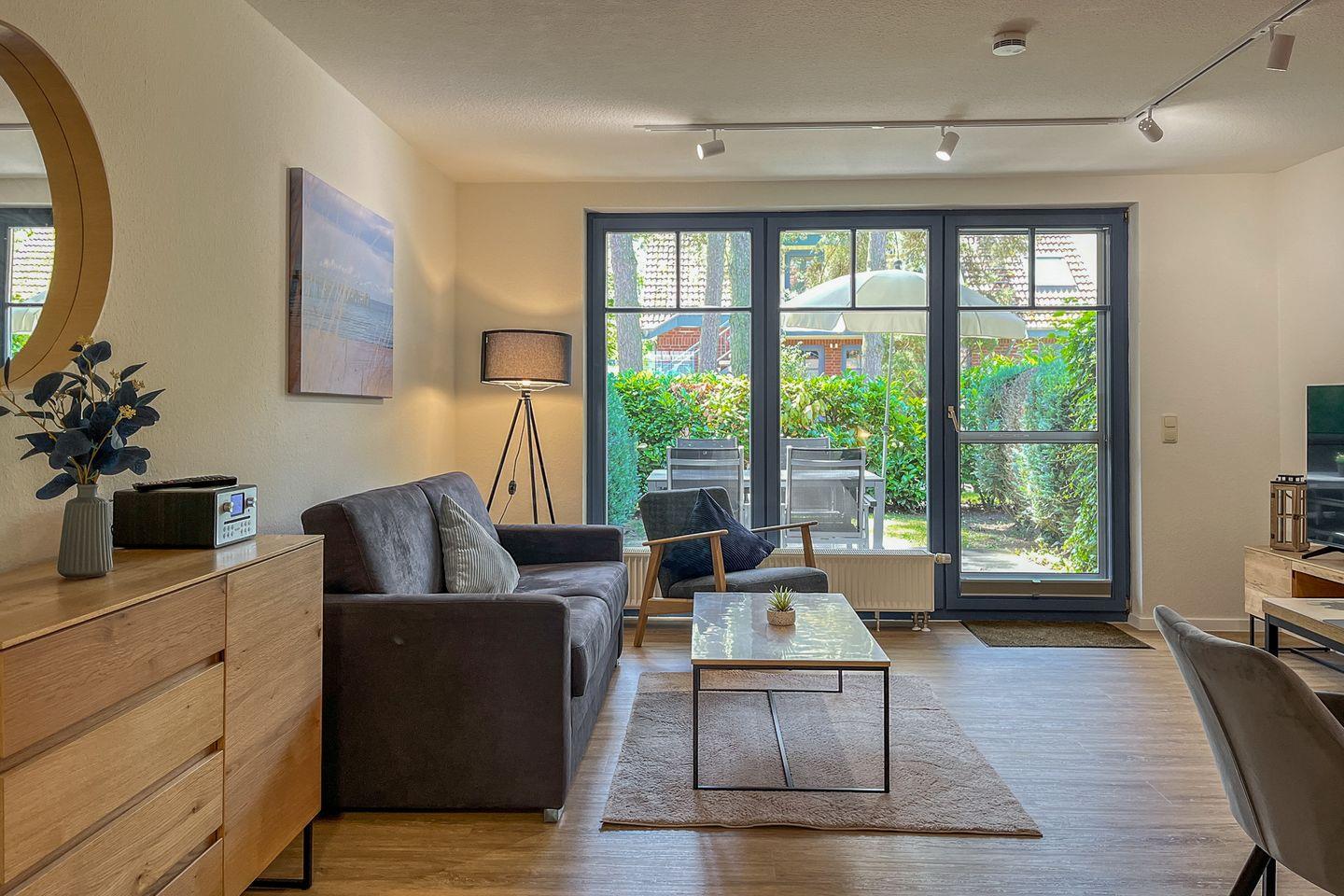 Im Haus 11 bewohnst du ein 2-Zimmer-Apartment für bis zu 4 Personen. Die ca. 55 m² große Wohnung liegt im Erdgeschoß und verfügt über eine Terrasse mit Süd-Ost-Ausrichtung. Es stehen ein Wohn- /Essbereich, eine Küchenzeile ein Duschbad und selbstverständlich ein Schlafzimmer zur Verfügung. Die Entfernung zum Strand beträgt von der Anlage Papillon ca. 250 m.