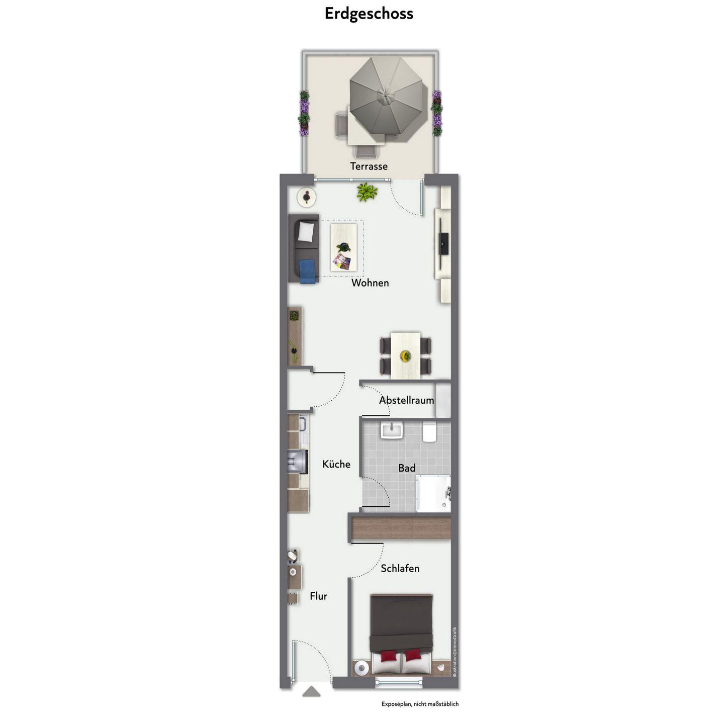 Das moderne Wohnzimmer ist mit einem bequemen Sofa mit Schlaffunktion (150 x 200 cm) und einem Esstisch für 4 Personen gestaltet. Hier können sich alle für gemeinsame Mahlzeiten zusammenfinden. Zur Unterhaltung steht ein Flachbild-TV zur Verfügung. Auf den möblierten Balkon kommst du direkt vom Wohnbereich aus.