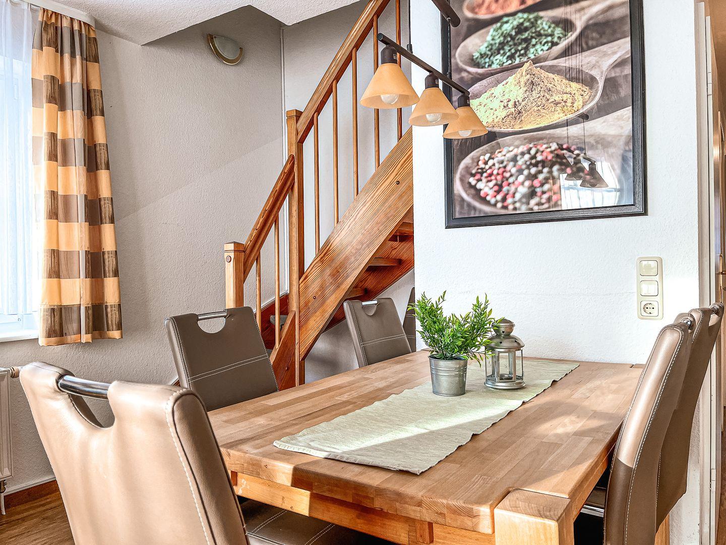 Für die Zubereitung eigener Mahlzeiten steht dir eine voll ausgestattete, offene Küche zur Verfügung. Ausgestattet mit einem 4- Platten-Ceranherd, Backofen, Kühlschrank, Geschirrspüler und allen notwendigen Küchenutensilien, wird es dir an nichts fehlen. Genieße das Frühstück auf dem Süd-Balkon, während du einen herrlichen Blick auf den Garten genießt - der perfekte Start in den Tag!